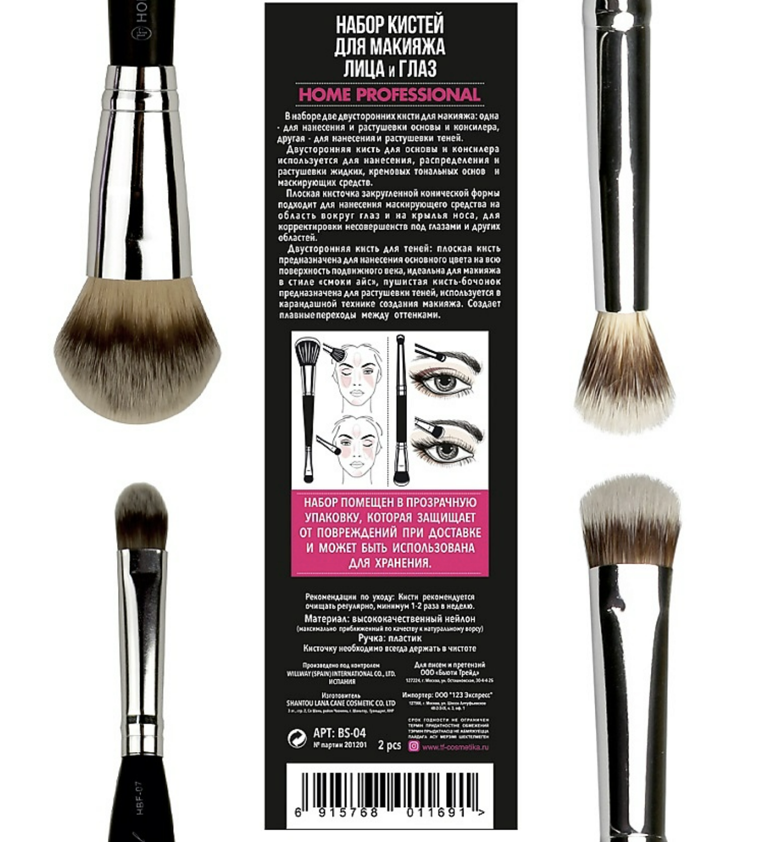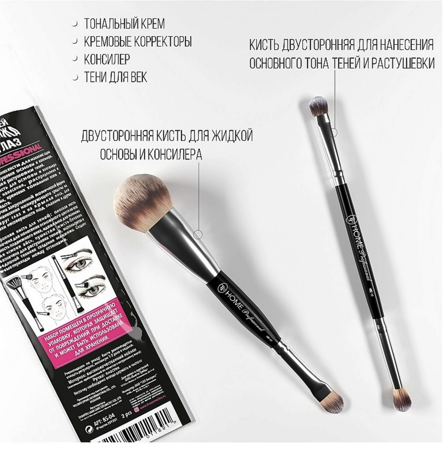 В наборе две двусторонних кисти для макияжа: одна- нанесения, распределения и растушевки жидких, кремовых тональных основ и маскирующих средств, другая- для нанесения и растушевки теней.