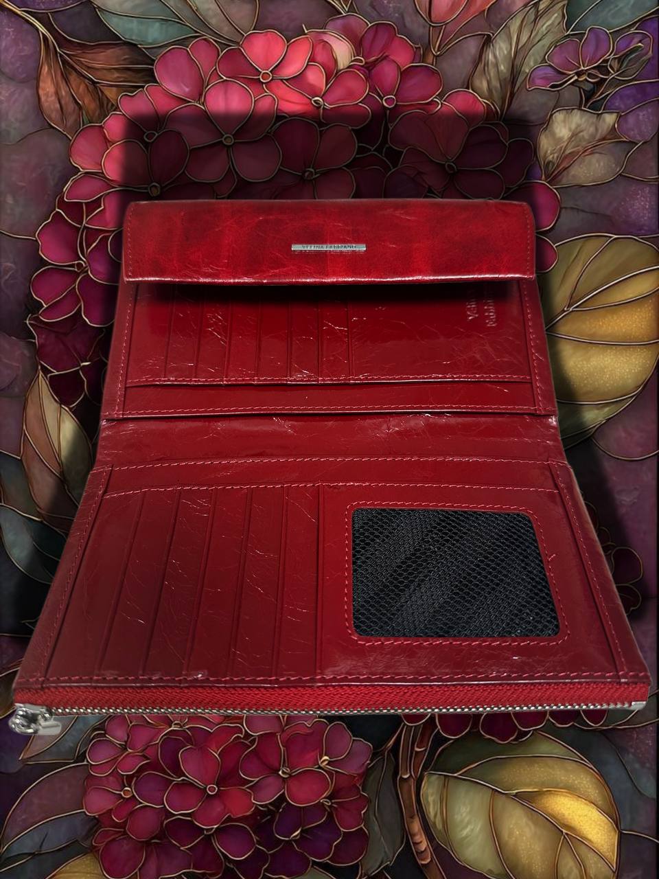 Женский кошелёк выполнен из натуральной кожи с гладкой поверхностью и благородным естественным блеском. Насыщенный красный цвет придаёт аксессуару выразительность и подчёркивает индивидуальный стиль.