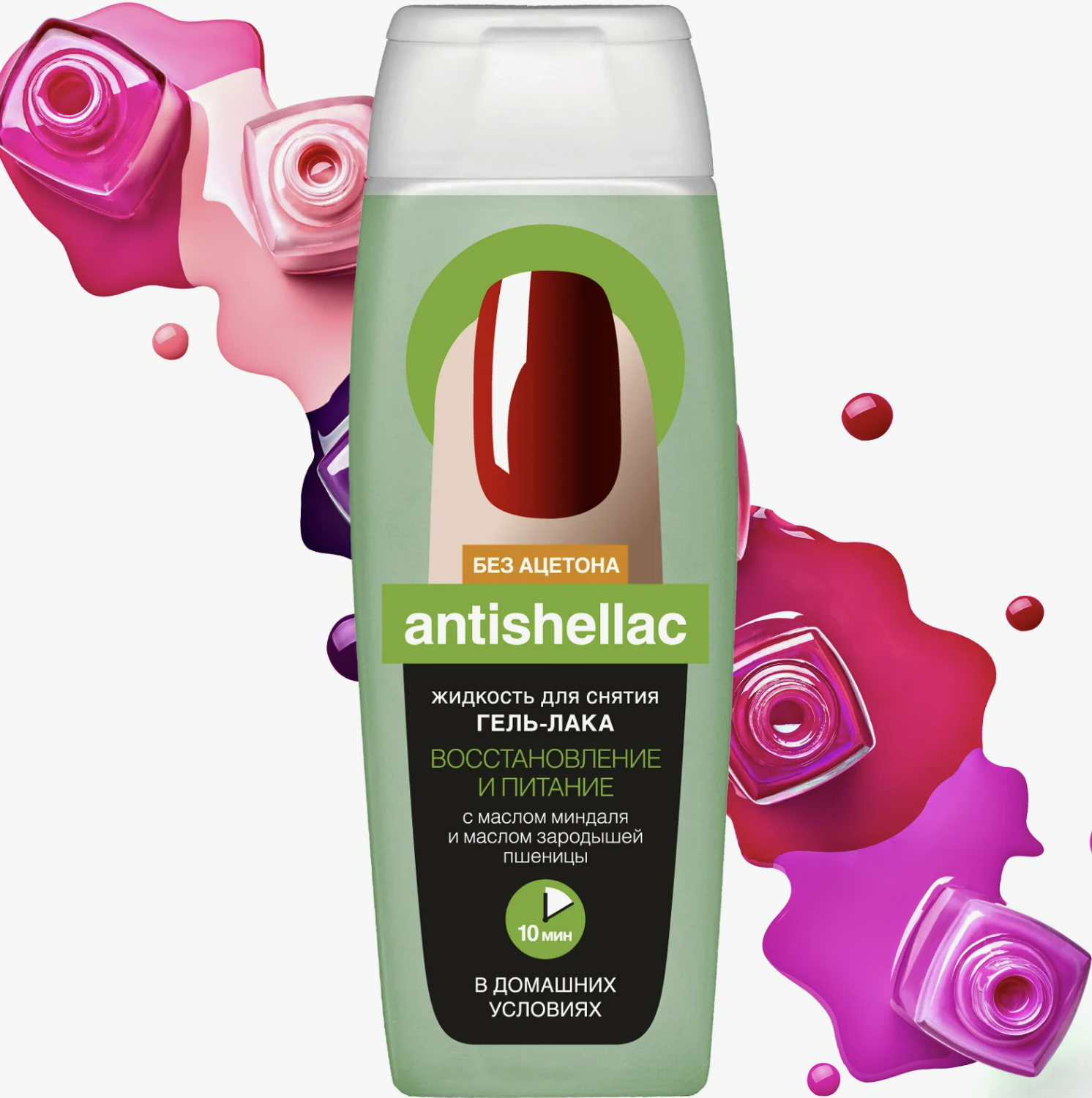 Жидкость для снятия гель - лака «antishellac» с маслом миндаля и маслом зародышей пшеницы. Восстановление и питание, быстрый эффект для поврежденных ногтей, без ацетона. Средство для самостоятельного удаления гель-лака в домашних условиях. Эффективно для снятия всех видов лака, shellac, гель - лака, акрила, биогеля, LED геля, удаления частиц клея, типс и элементов ногтевого дизайна, страз, бульонок, блёсток и слюды. Комплекс эффективных для ухода за ногтями масел питает и восстанавливает тонкие, поврежденные в результате внешнего воздействия, ногти. Ногти становятся крепкими и здоровыми. Способ применения: Для снятия обычного лака: нанесите жидкость на ватный диск, приложите к ногтю, удалите лак. Для снятия стойкого лака: смочите ватные диски, наложите их на ногти, оберните кончики пальцев фольгой на 10 минут, удалите гель - лак деревянной палочкой. После применения вымыть руки в проточной воде.