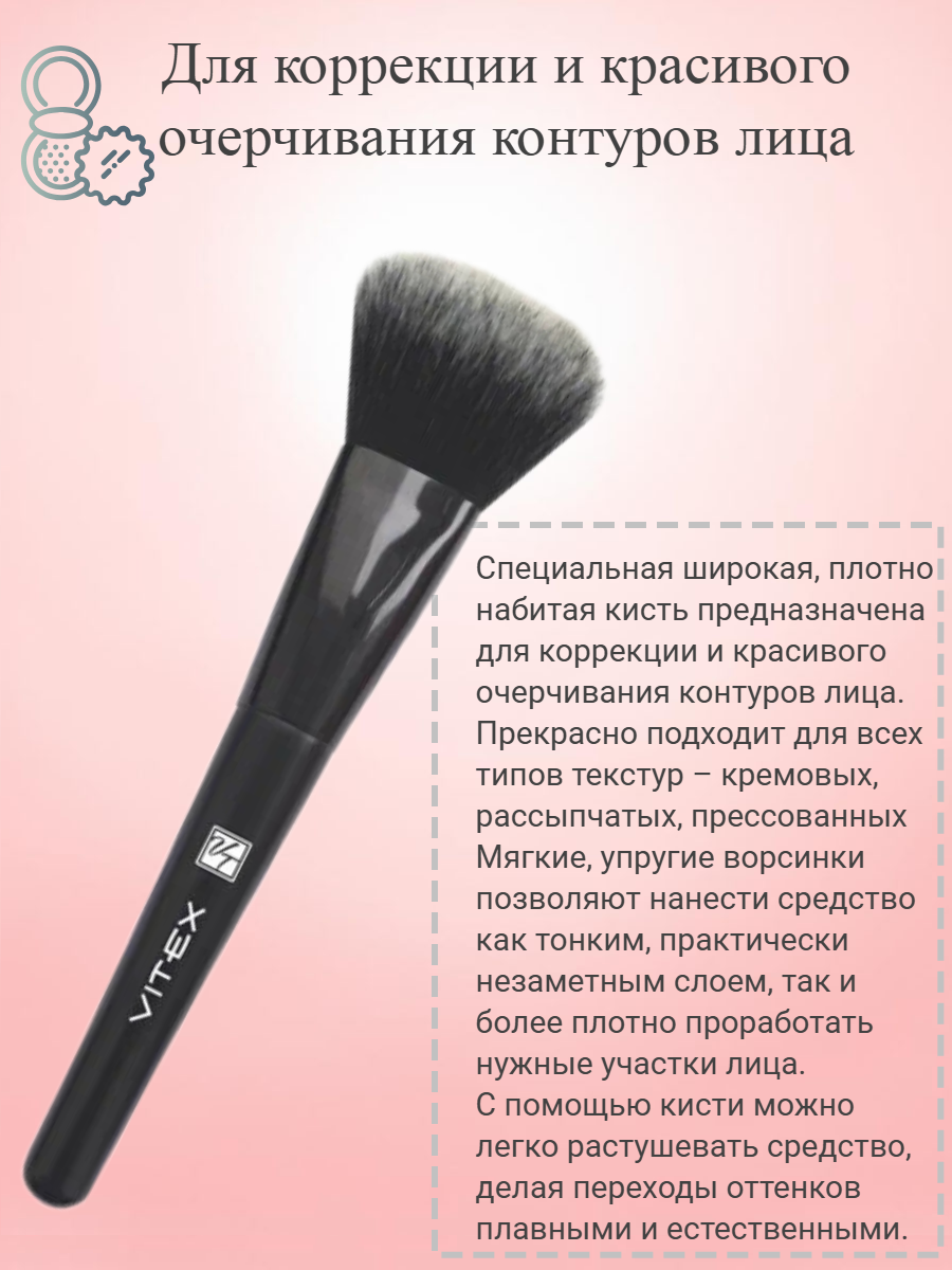 Специальная широкая, плотно набитая кисть предназначена для коррекции и красивого очерчивания контуров лица. Прекрасно подходит для всех типов текстур – кремовых, рассыпчатых, прессованных и т.д. Мягкие, упругие ворсинки позволяют нанести средство как тонким, практически незаметным слоем, так и более плотно проработать нужные участки лица. С помощью кисти можно легко растушевать средство, делая переходы оттенков плавными и естественными. Материал ворса: высококачественный гипоаллергенный нейлон