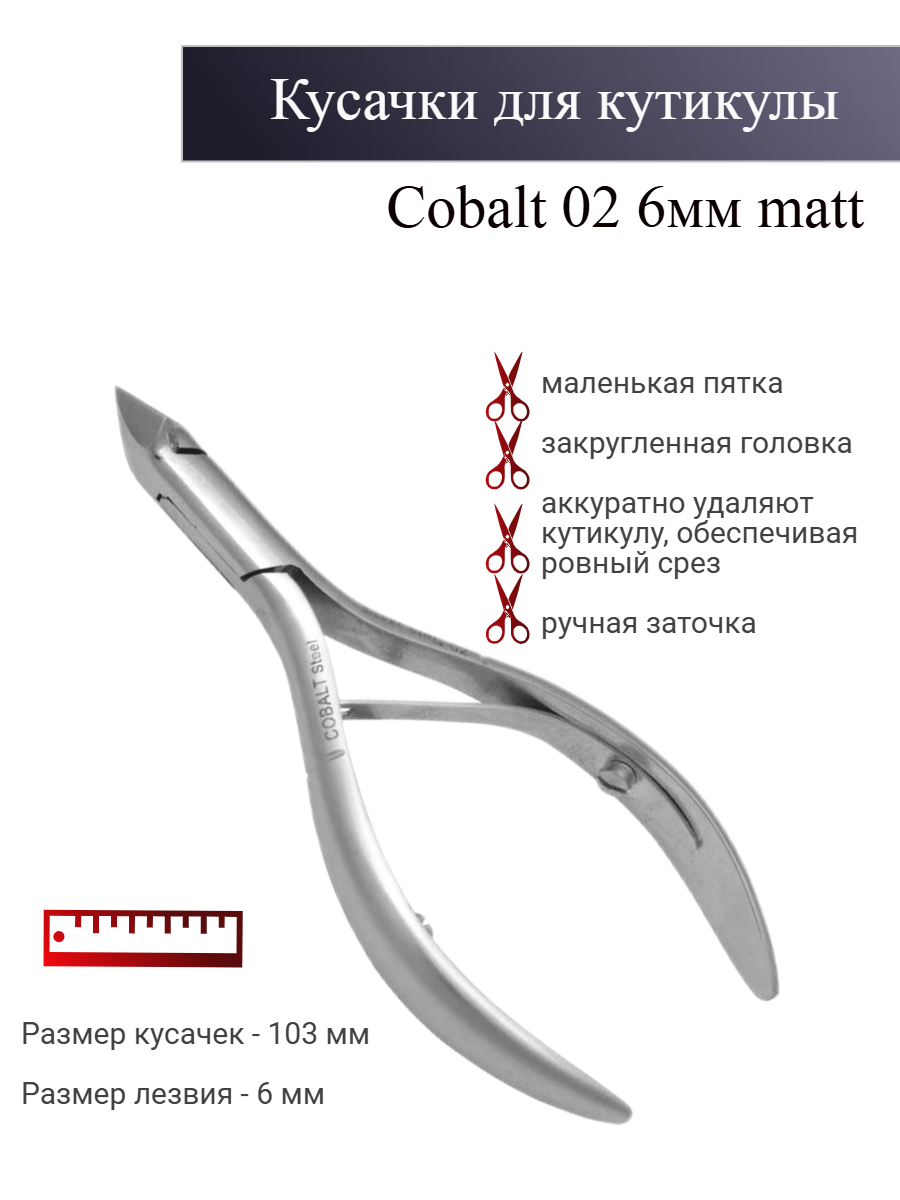 Модель Cobalt 02 Matt - длина лезвий 6 мм, маленькая пятка, закругленная головка, матовые. Кусачки серии Cobalt изготовлены из высококачественной стали повышенной твердости с добавлением кобальта (50-52 HRC). Серия Кобальт - это профессиональная линейка, предназначена для мастеров маникюра, начинающих мастеров, учеников, пользуется высоким спросом. Кусачки для кутикулы Silver Star позволяют сделать идеальный маникюр - аккуратно удаляют кутикулу, обеспечивая ровный срез. Кусачки заточены вручную, что гарантирует остроту лезвий, отрегулированный плавный и ровный ход, идеальное схождение режущих поверхностей.