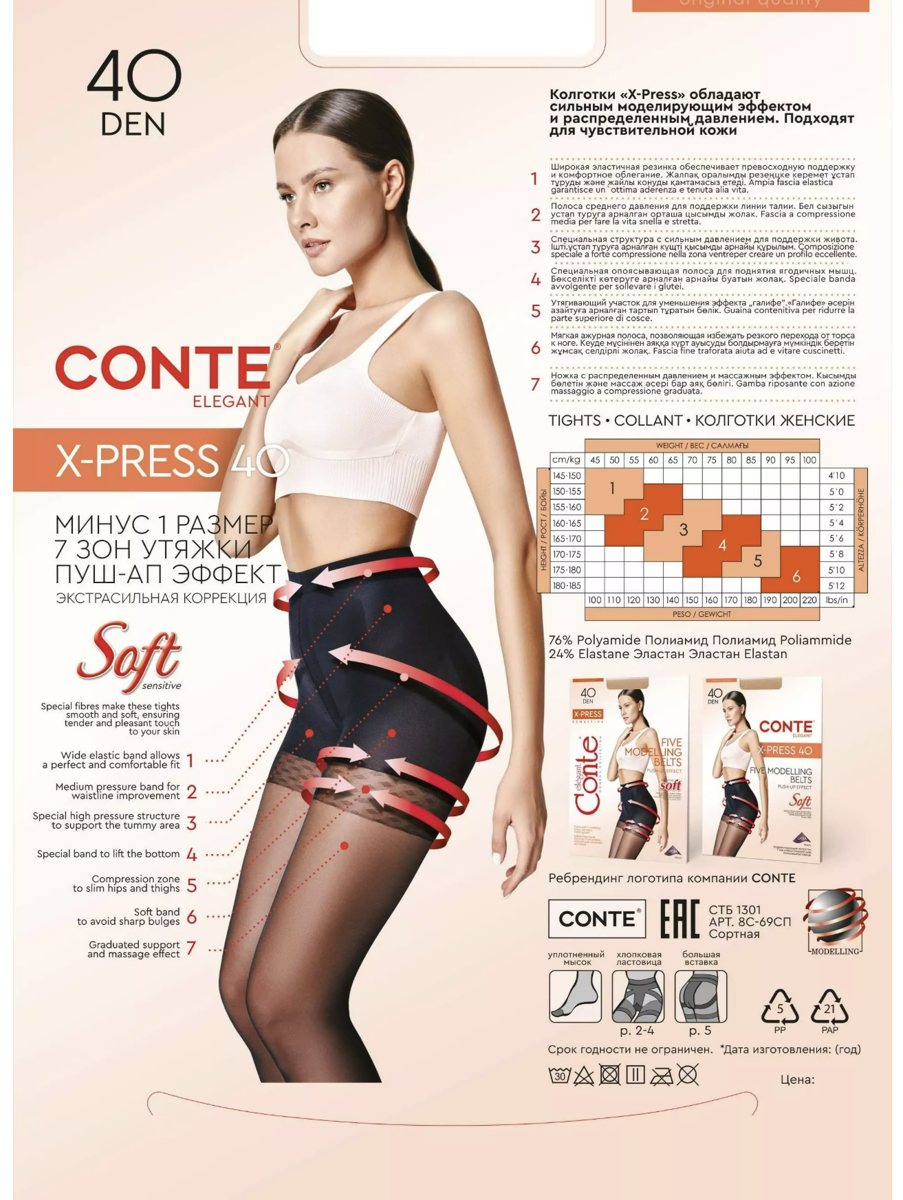 Модель X-PRESS - колготки с превосходным эффектом моделирования фигуры, что даёт возможность достичь максимального эффекта. Специальная конструкция торса с 7 зонами утяжки поможет уменьшить объём бёдер, сформировать стройную талию и плоский живот. В модели X-PRESS есть специальная эластичная полоса, которая даёт эффект push-up. Она приподнимает мышцы ягодиц, делая их более подтянутыми и упругими.
