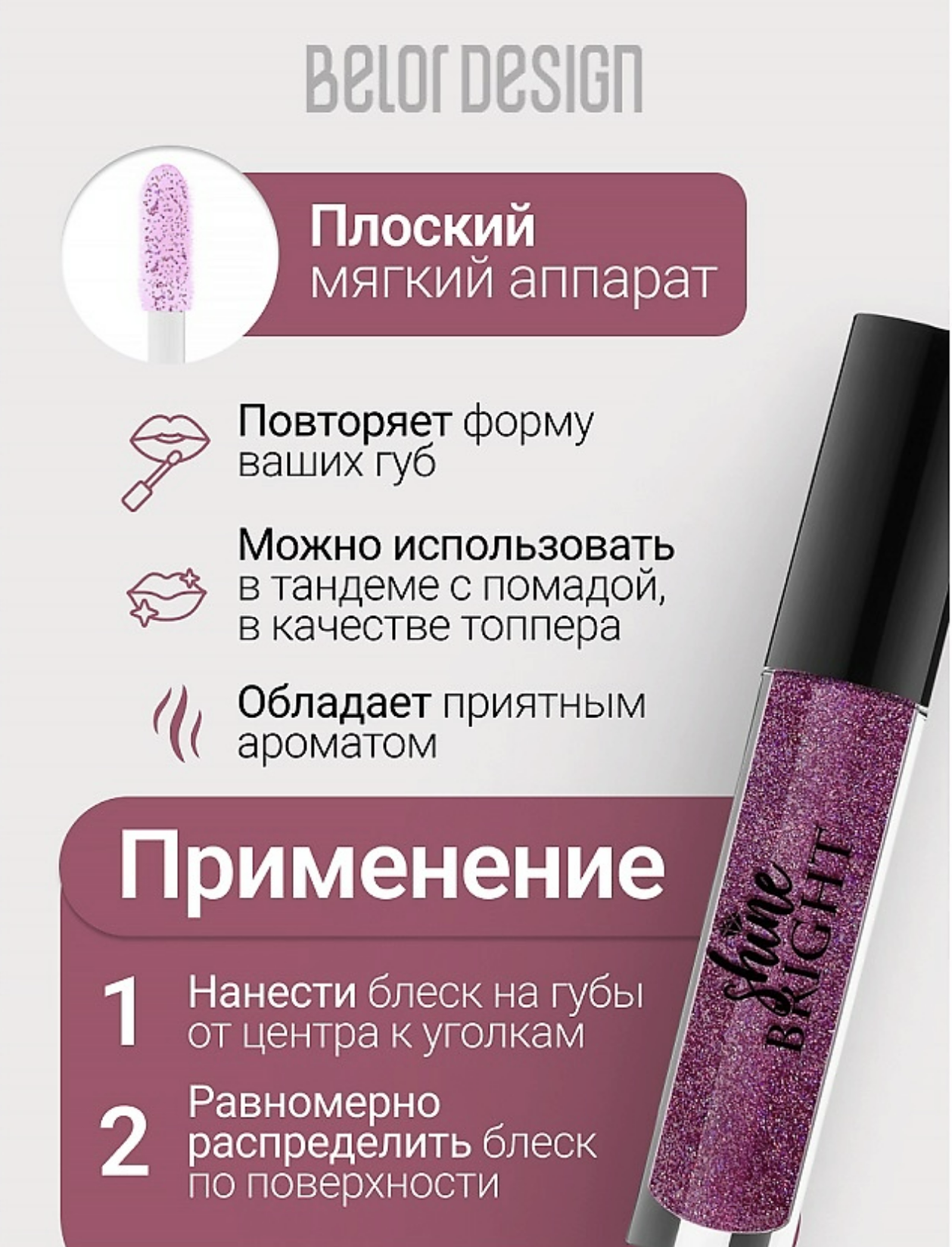 Shine bright like a diamond!А как насчет бриллиантов на губах?Блеск для губ "Shine Bright" совершенно нового уровня: текстура легкого геля, придающая губам невероятный объем и ослепительное зеркальное сияние!В состав продукта входит разнодисперсный шиммер, создающий многогранную игру переливов бриллиантовой крошки.Сияние и невероятные переливы готовы играть на ваших губах в течение нескольких часов подряд без затекания за контуры губ.Покрытие имеет прозрачный финиш, сглаживает поверхность кожи, не оставляя ощущения липкости.Плоский мягкий аппликатор повторяет форму ваших губ, обеспечивает максимально равномерное нанесение.Витамин Е в составе защищает кожу и дополнительно ухаживает за ней, наполняя увлажнением и мягкостью. Палитра представлена в трех сияющих текстурах: глитерные - для создания смелых и насыщенных образов, глянцевые -для свежих и объемных губ и прозрачный "жидкое стекло" на любой случай жизни.