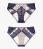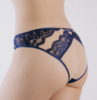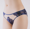 Трусы слипы женские изготовлены из полиамида. Трусы имеют среднюю посадку, удерживаются во время носки тонкой мягкой резинкой. Ткань выполнена в синем цветочном кружеве, спереди и сзади имеются сетчатые вставки. На задней части имеется треугольный вырез. На внутренней стороне трусов расположена хлопковая ластовица.