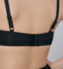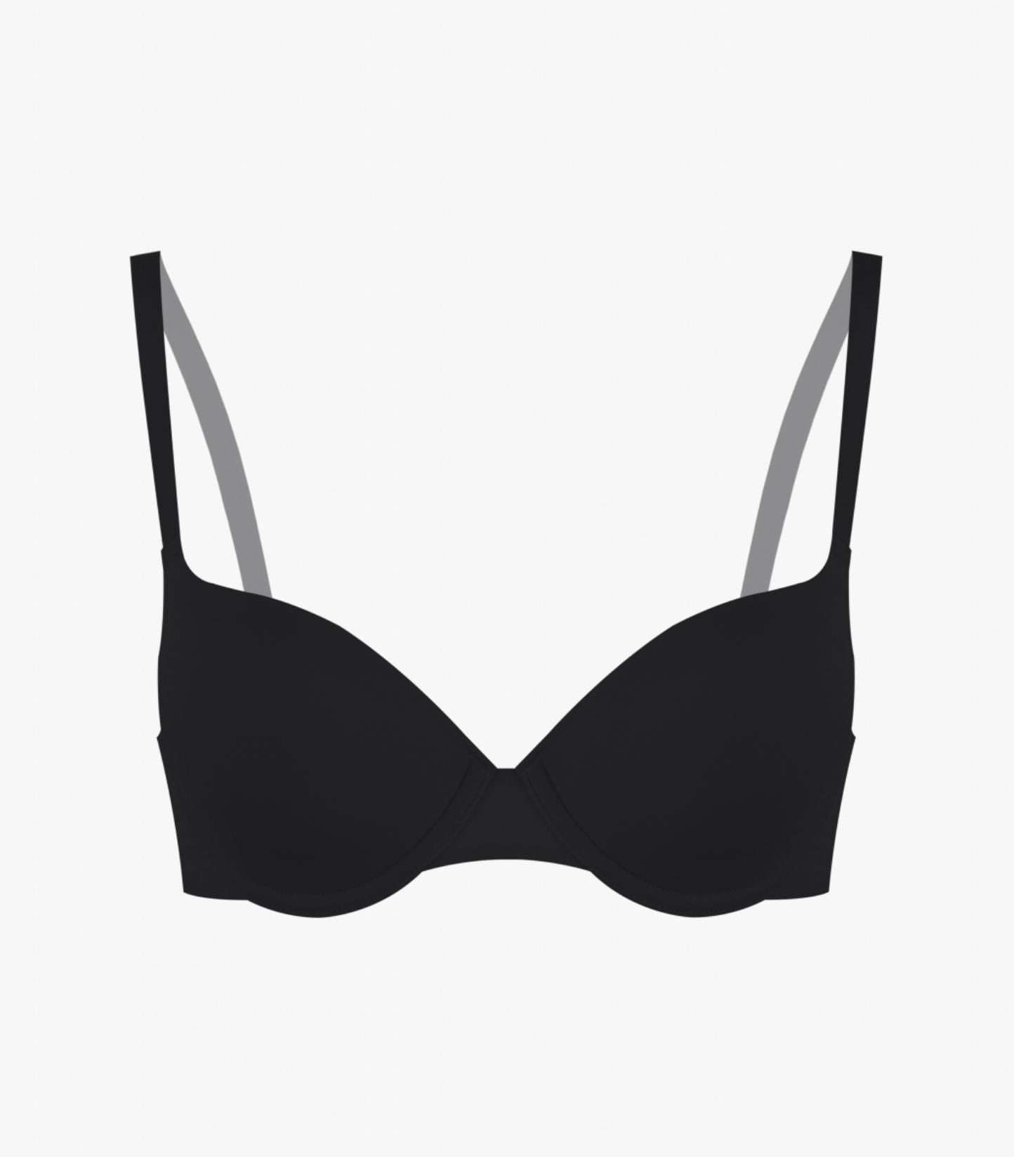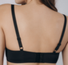 Базовый черный бюстгальтер на косточках изготовлен из полиамида, мягкой и эластичной ткани. Тонкие поролоновые чашки на косточках создают естественную форму без push-up эффекта. Тонкие регулируемые бретели равномерно распределяют нагрузку на плечи, застежка на крючках сзади позволяет настроить необходимую посадку.