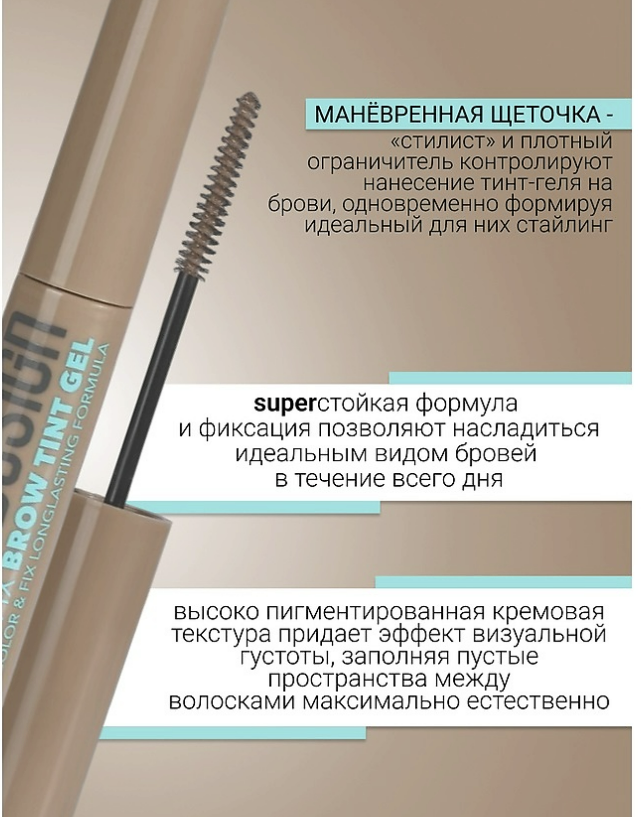 Сочетает в себе естественный цвет, фиксацию и superстойкость - заменяет сразу несколько brow-продуктов. Высоко пигментированная кремовая текстура придает эффект визуальной густоты, заполняя пустые пространства между волосками максимально естественно. Мгновенно адаптируется под природный оттенок ваших волос. Манёвренная щеточка - «стилист» и плотный ограничитель контролируют нанесение тинт-геля на брови, одновременно формируя идеальный для них стайлинг. Superстойкая формула и фиксация позволяют насладиться идеальным видом бровей в течение всего дня. При необходимости можно наслаивать для более интенсивного результата. Представлен в 4-ех оттенках, подчеркивающих природную красоту. Смывается средствами для демакияжа. Прокрашивайте, делая легкие штрихи щеточкой по направлению роста волосков. Состав/Ingredients:Aqua, Propylene Glycol, Trimethylsiloxysilicate, Isododecane, PVP, Trilaureth-4 Phosphate, Methyl Rosinate, Polyacrylate Crosspolymer-11, Phenoxyethanol, PPG-26-Buteth-26, Panthenol, PEG-40/Hydrogenated Castor Oil, Parfum, Ethylhexylglycerin, Benzyl Salicylate, Geraniol, (+/- CI 77491, CI 77492, CI 77499, CI 77891).