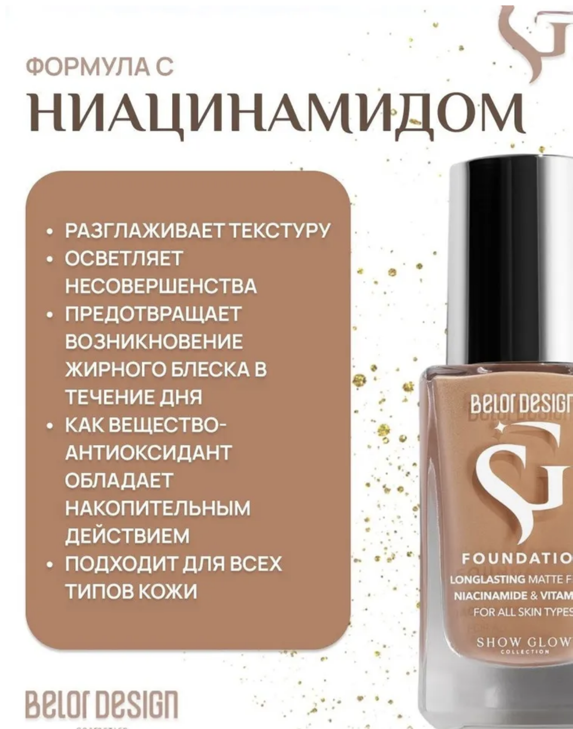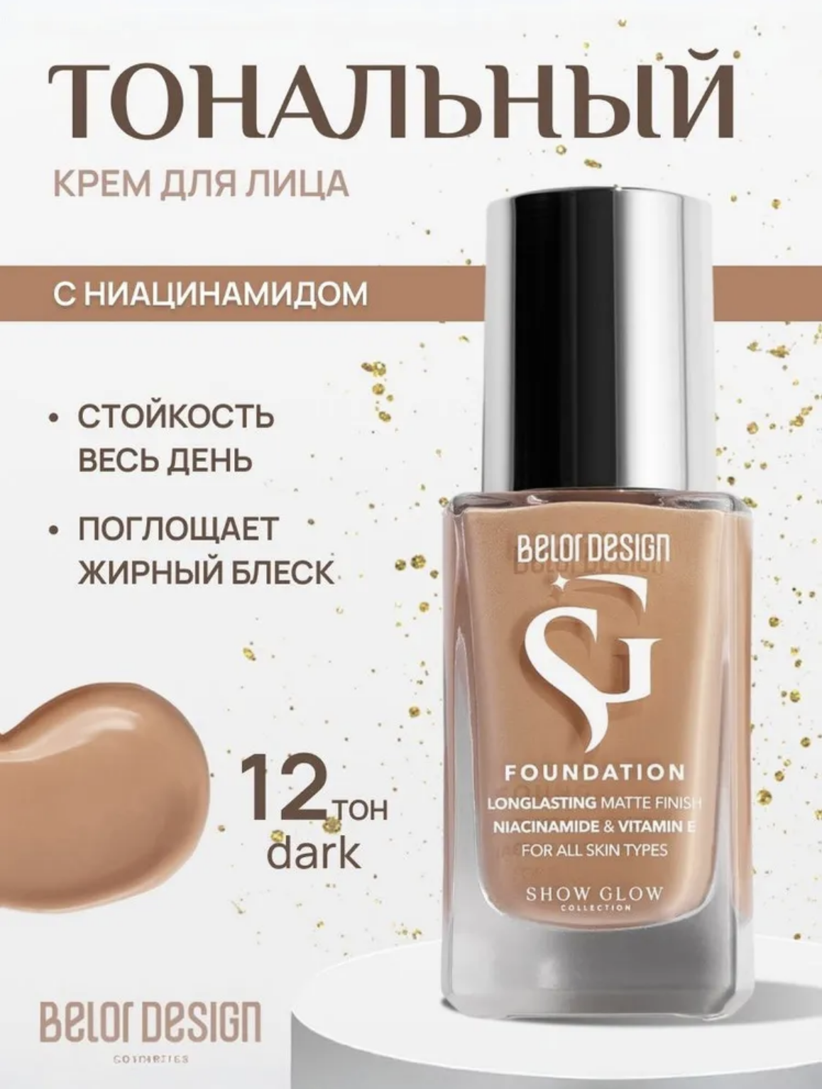 Стойкий тональный крем для лица не только поможет усовершенствовать вид кожи, но и позаботится о ее внешнем состоянии. Формула с Ниацинамидом работает на разглаживание текстуры, осветление несовершенств и предотвращает возникновение жирного блеска в течение дня. Как вещество-антиоксидант обладает накопительным действием и подходит для всех типов кожи.