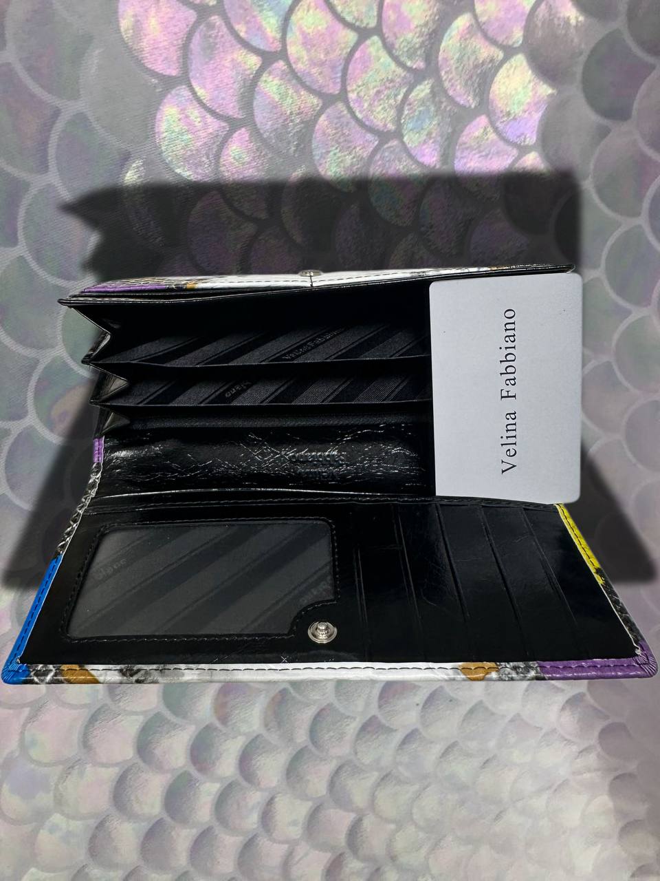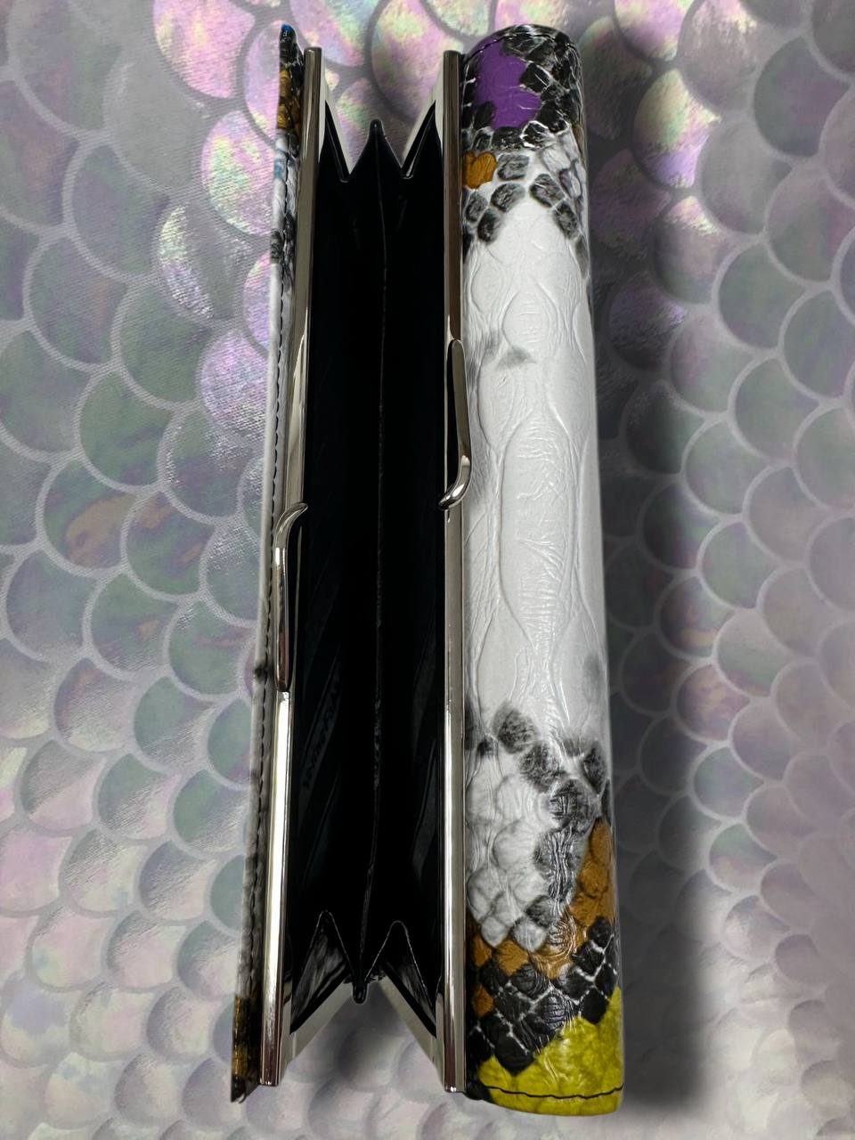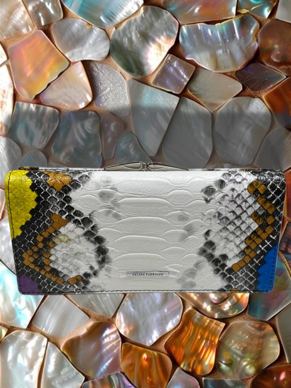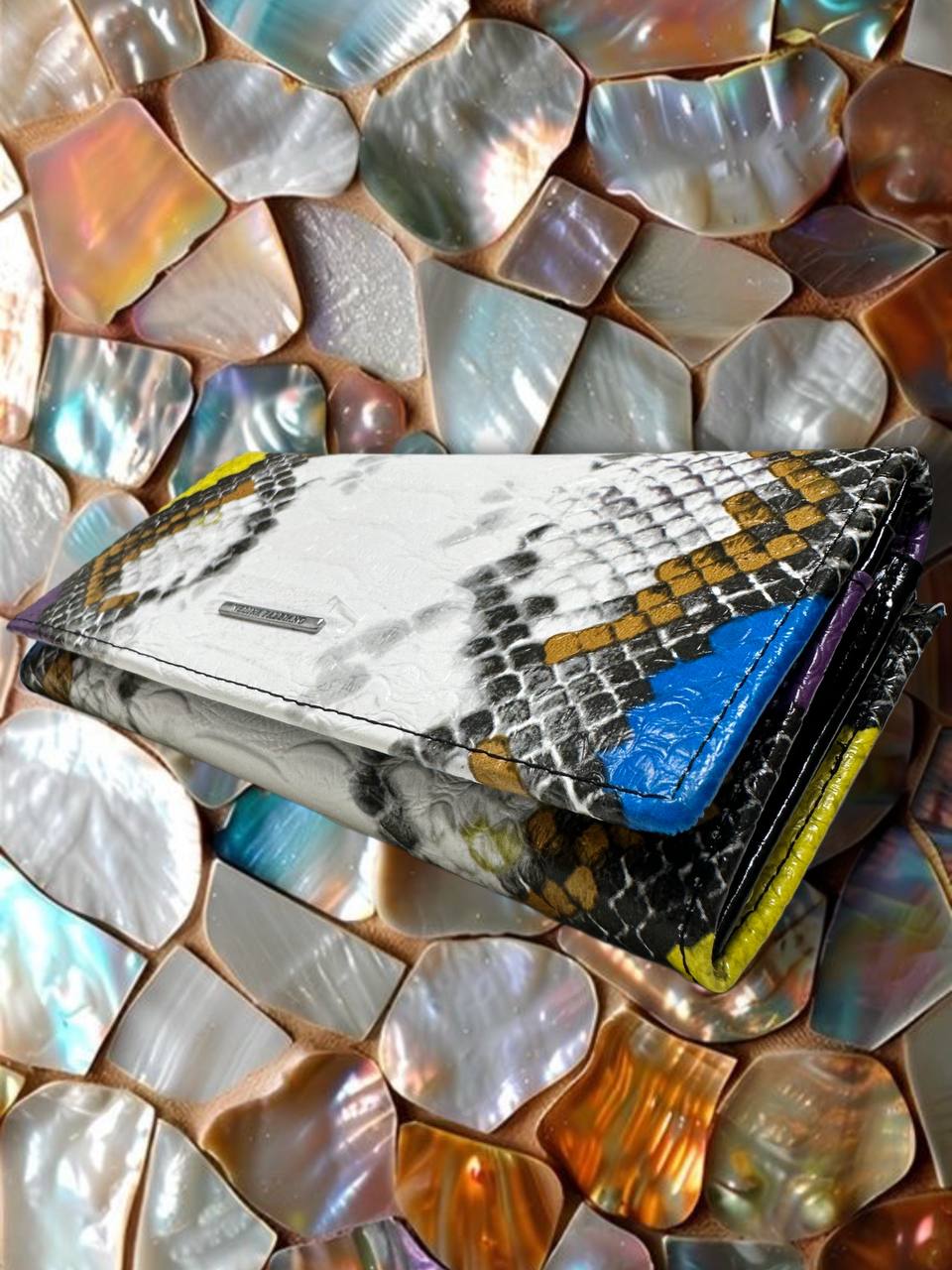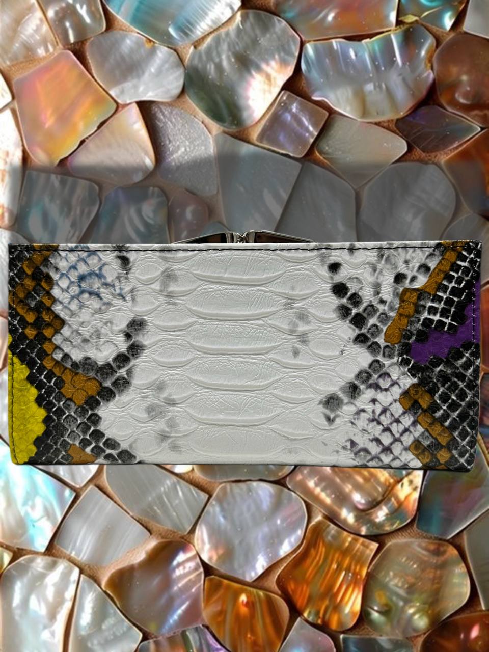 Этот кошелёк — не просто аксессуар, а настоящий арт-объект. Его дизайн вдохновлён природной текстурой змеиной кожи и переливами перламутра. Бело-чёрная основа с графичным узором дополнена яркими акцентами синего, фиолетового и лаймового — смело, модно и очень стильно.