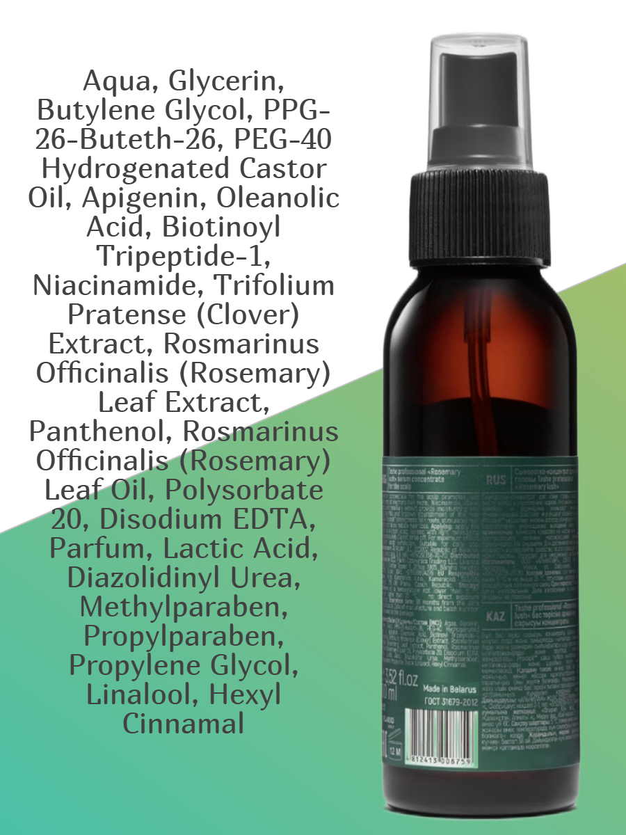 Состав: Aqua, Glycerin, Butylene Glycol, PPG-26-Buteth-26, PEG-40 Hydrogenated Castor Oil, Apigenin, Oleanolic Acid, Biotinoyl Tripeptide-1, Niacinamide, Trifolium Pratense (Clover) Extract, Rosmarinus Officinalis (Rosemary) Leaf Extract, Panthenol, Rosmarinus Officinalis (Rosemary) Leaf Oil, Polysorbate 20, Disodium EDTA, Parfum, Lactic Acid, Diazolidinyl Urea, Methylparaben, Propylparaben, Propylene Glycol, Linalool, Hexyl Cinnamal