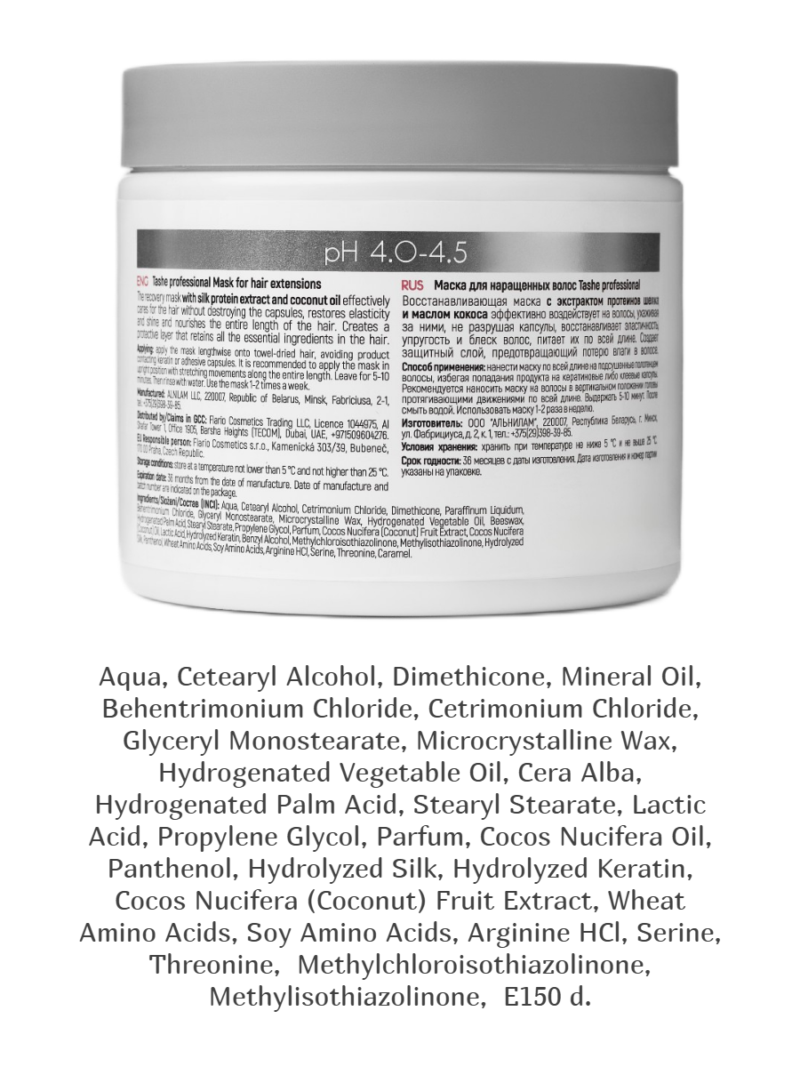 При регулярном использовании продлевает носку наращенных прядей на 30%. Наращенные волосы требуют особого домашнего ухода, поэтому использование масок становится необходимым как для поддержания внешнего вида наращенных, так и для питания и укрепления своих прядей. Диметикон, вазелиновое масло, пчелиный воск, масло кокоса в составе бережно воздействуют на наращенные волосы, ухаживая за ними, не разрушая капсулы. Д-пантенол, экстракт протеинов шелка, аминокомплекс, гидролизованный кератин придают волосам шелковистость, блеск и объем. Предотвращают электризуемость волос, спутываемость, решают проблему тусклости. ВАЖНО! При использовании маски на наращенных волосах избегайте попадания на капсулы. Aqua, Сetearyl Alcohol, Dimethicone, Mineral Oil, Behentrimonium Chloride, Cetrimonium Chloride, Glyceryl Monostearate, Microcrystalline Wax, Hydrogenated Vegetable Oil, Cera Alba, Hydrogenated Palm Acid, Stearyl Stearate, Lactic Acid, Propylene Glycol, Parfum, Coсos Nucifera Oil, Panthenol, Hydrolyzed Silk, Hydrolyzed Keratin, Cocos Nucifera (Coconut) Fruit Extract, Wheat Amino Acids, Soy Amino Acids, Arginine HCl, Serine, Threonine, Methylchloroisothiazolinone, Methylisothiazolinone, E150 d.