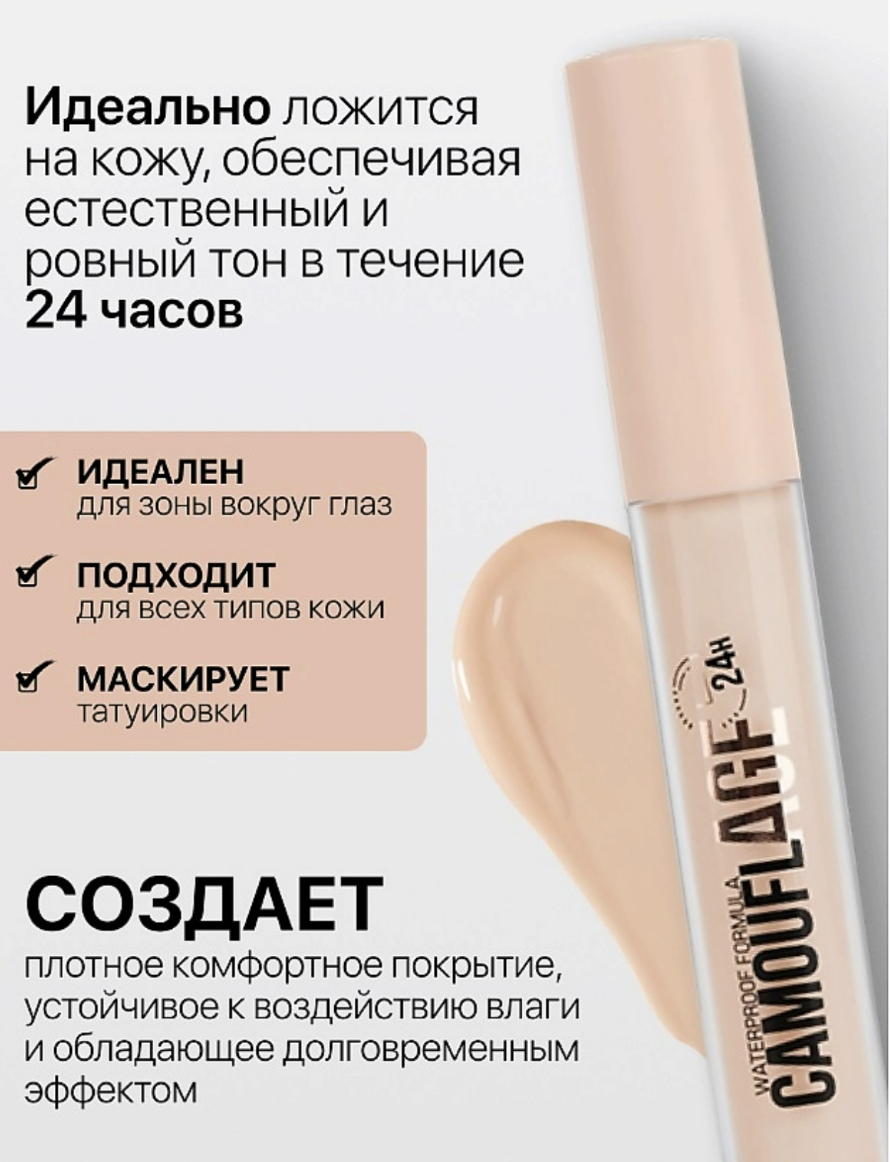 Помогает быстро и эффективно скрыть все несовершенства на коже. Отлично маскирует татуировки. Создает плотное комфортное покрытие, устойчивое к воздействию влаги и обладающее долговременным эффектом. Идеально ложится на кожу, обеспечивая естественный и ровный тон. Способ применения Нанесите на участки кожи, которые необходимо скорректировать. Состав WATER,TRIMETHYLSILOXYSILICATE,ISODODECANE,CI 77891, CYCLOPENTASILOXANE, BIS-DIGLYCERYL POLYACYLADIPATE-2, SILICA,MICA,DISTEARDIMONIUM HECTORITE,CI 77492, CAPRYLYLMETHICONE,MAGNESIUM SULFATE,PHENOXYETHANOL,CI 77491,CI 77499.
