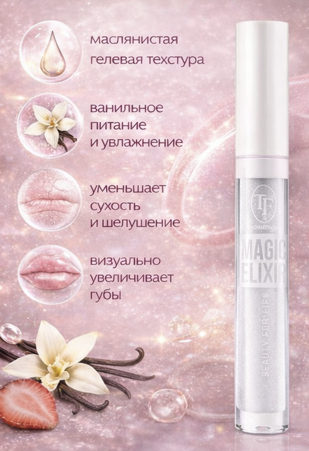Масло с нежным ароматом ванили отлично питает, увлажняет и визуально делает губы чуть более пухлыми и глянцевыми.