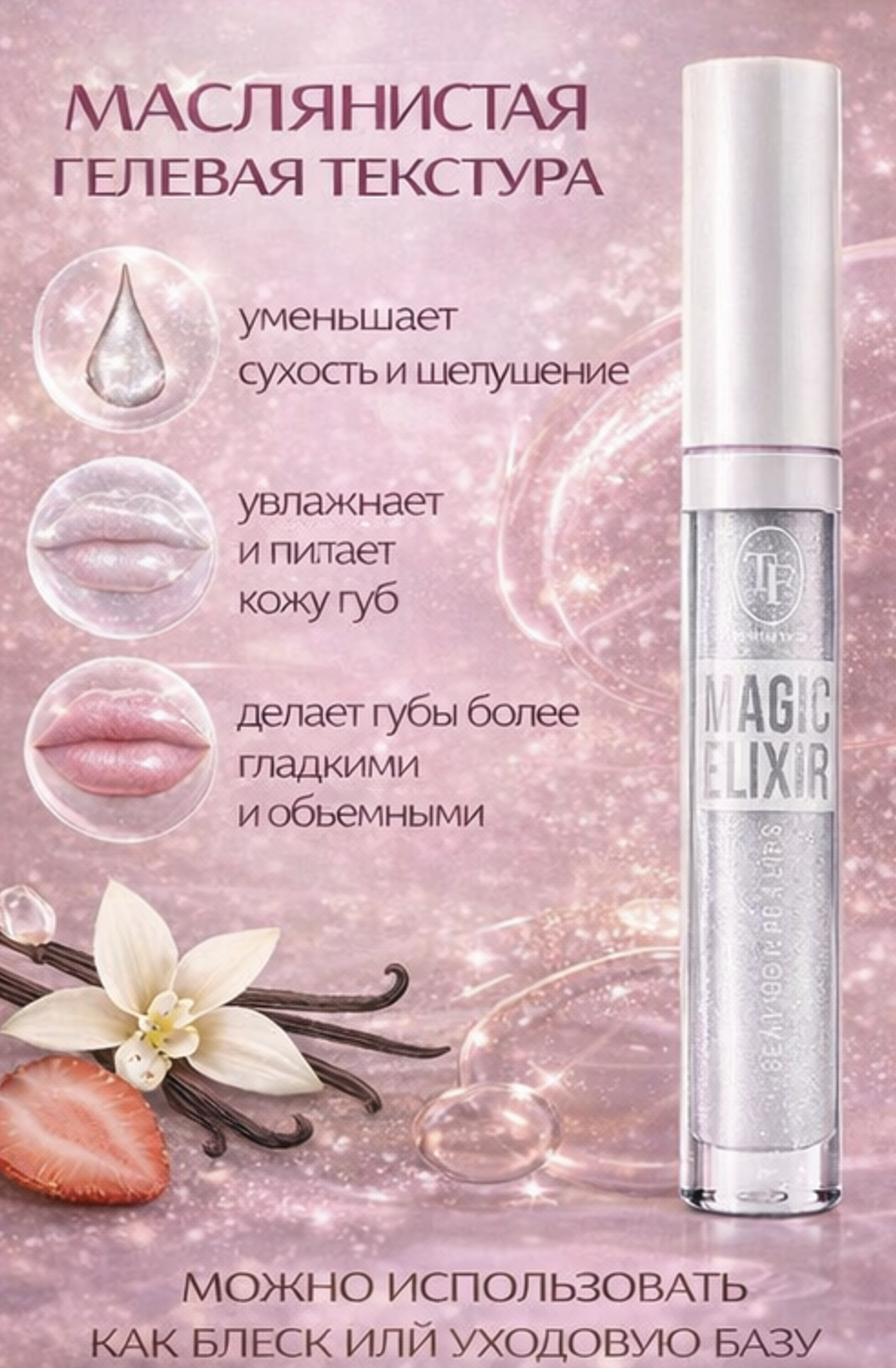 Можно использовать как соло – в роли блеска для губ, а также как базу и уход перед и после нанесения помад.