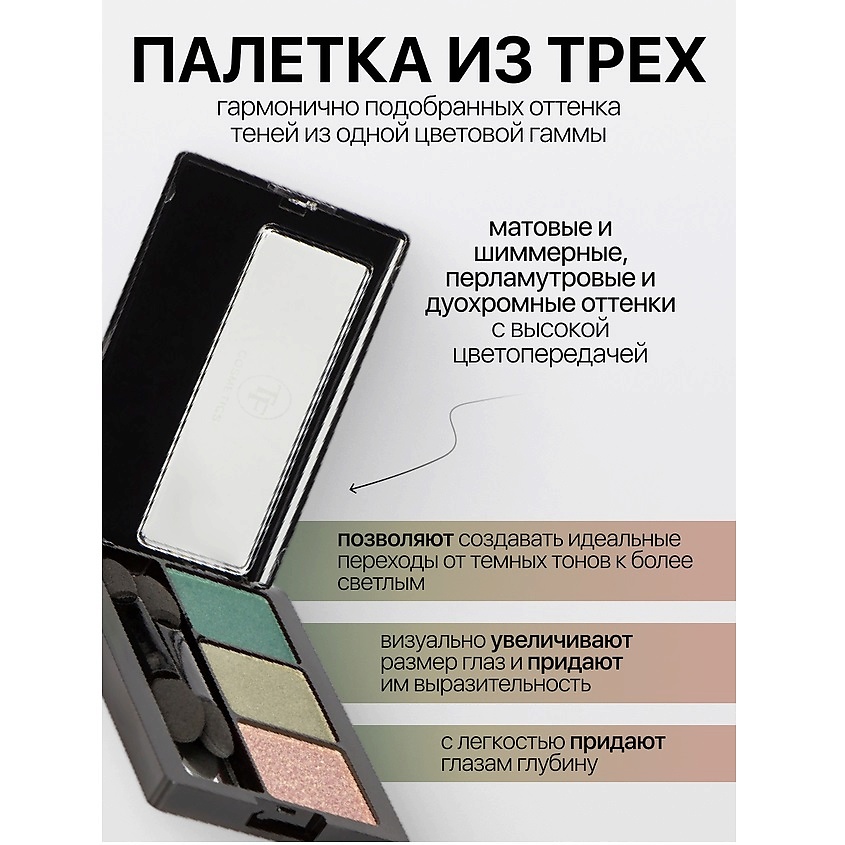 Три гармонично подобранных оттенка теней из одной цветовой гаммы, позволят создавать идеальные переходы от темных тонов к более светлым.Матовые и шимерные, перламутровые и дуохромные оттенки с высокой цветопередачей, позволяют визуально увеличить размер глаз и придать им выразительность.Трехцветные тени станут базовым средством для профессиональных визажистов в создании образов для выхода в свет, так и для новичков, пробующих сделать повседневный элегантный макияж.Благодаря контрасту темных и светлых оттенков в палетке, можно с легкостью придать глазам глубину, создать макияж в стиле Smoky eyes или Nude.Сочетание различных текстур обеспечивает идеальную растушевку и хорошее смешение цветов.Матовые, перламутровые, дуохромные, шимерные. Способ применения Нанести тени на веко кистью, аппликатором или спонжем и растушевать. Состав Talc, Polyethylene Terephthalate, Caprylic/Capric Triglyceride, Zinc Stearate, PTFE, Ethylene/Acrylic Acid Copolymer, Sodium Dehydroacetate, Phenoxyethanol, Sobric Acid, Acrylates Copolymer, Tin Oxide, CI 77019 (Mica), CI 77891 (Titanium Dioxide), CI 77491/77492/77499 (Iron Oxides), CI 77000 (Aluminum Powder), CI 75470 (Carmine), CI 77510 (Ferric Ferrocyanide), CI 77742 (Manganese Violet), CI 77163 (Bismuth Oxychloride).