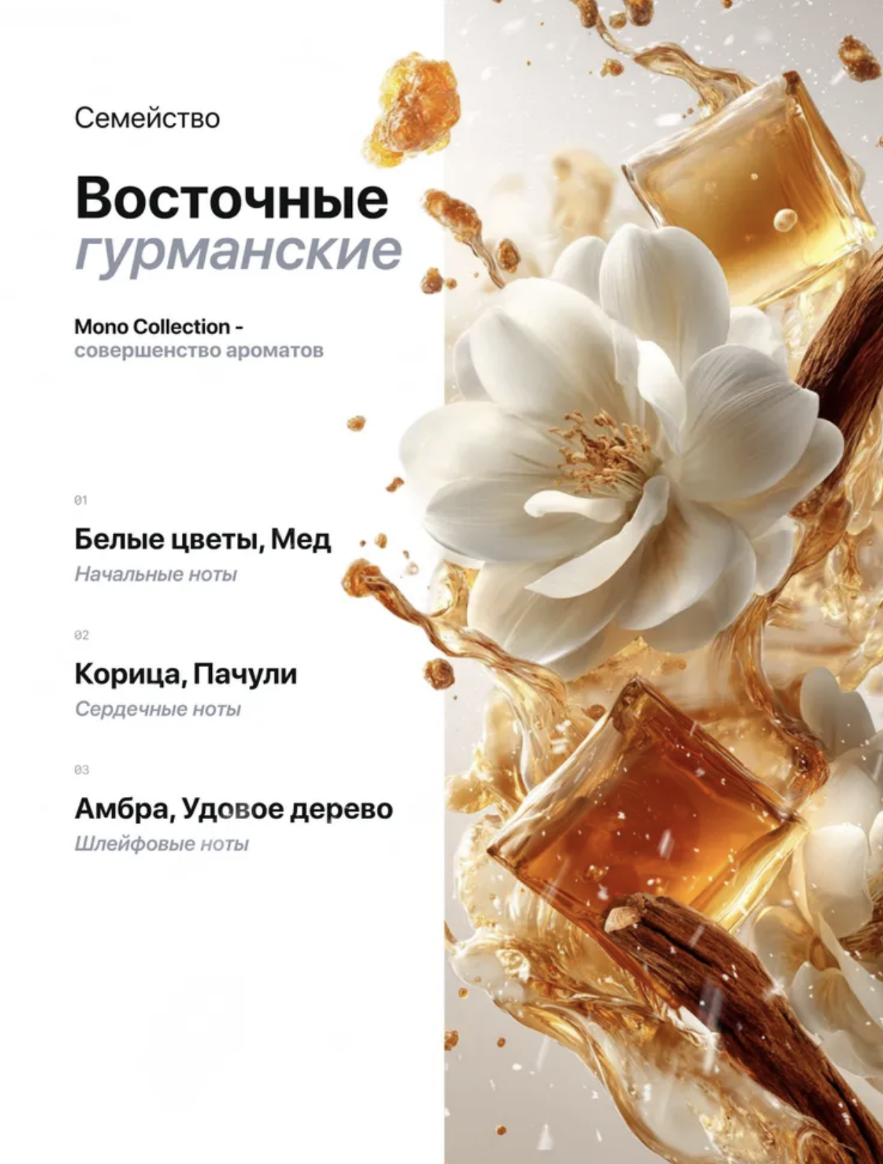 Wood Honey – баланс теплой древесины и сладкого меда создает ощущение мягкой роскоши и бархатистого прикосновения. Аромат дерева глубокий и величественный, его насыщенные согревающие ноты наполняют чувством уверенности и гармонии. Мед добавляет композиции сладости и бархатистости, придавая аромату мягкость и глубину, а его текстура погружает в расслабляющее состояние.