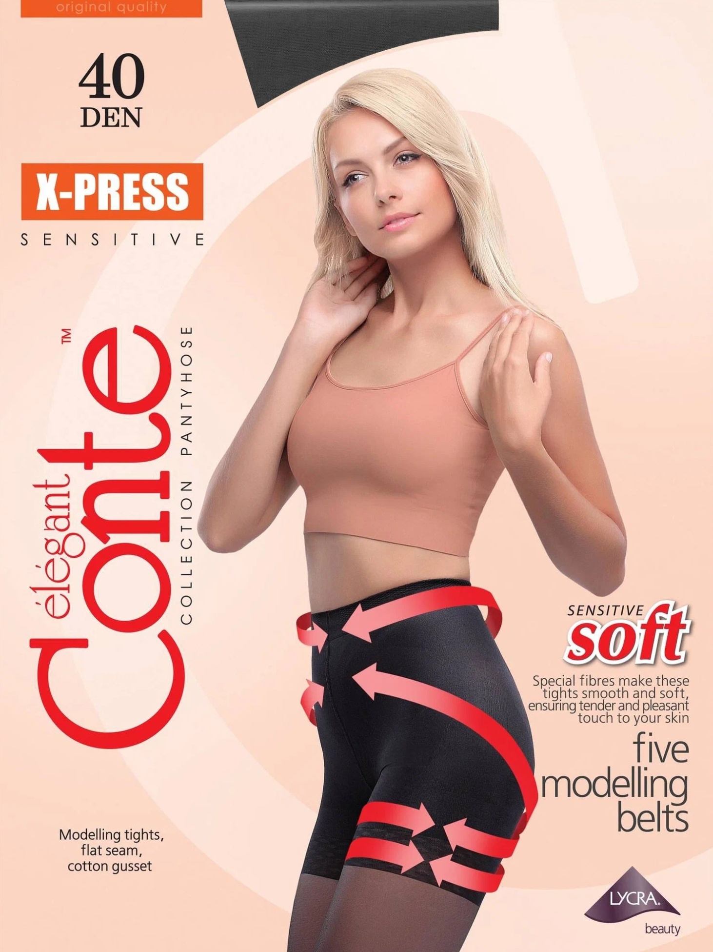 Nero Черный Колготки «X-PRESS» обладают великолепным моделирующим эффектом и распределенным давлением  Широкая эластичная резинка обеспечивает превосходную поддержку и комфортное облегание  Полоса среднего давления для поддерживания линии талии  Специальная структура для поддержки живота  Специальная опоясывающая полоса для поднятия ягодичных мышц  Утягивающий участок для уменьшения эффекта «галифе»  Мягкая ажурная полоса позволяющая избежать резкого перехода от торса к ноге  Ножка с распределённым давлением и массажным эффектом Плотные моделирующие колготки, плоский шов, хлопковая ластовица 76% Полиамид / Polyamide 24% Эластан / Elastan Плотность Размеры 40 Den 2 3 4 5