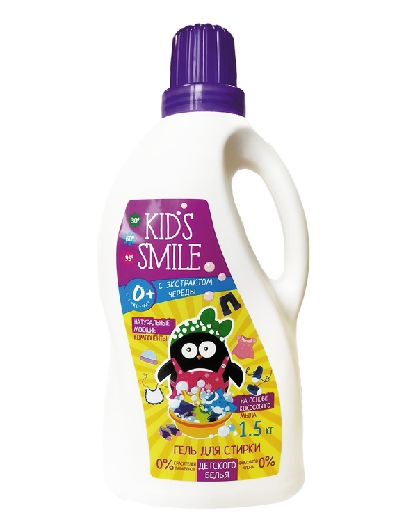 Гель для стирки детского белья KIDS SMILE - мягкое универсальное средство для стирки детской одежды, белья и пеленок с первых дней жизни ребенка. Формула средства не содержит фосфатов, хлора, красителей и других агрессивных компонентов. Подходит для стирки одежды людей с чувствительной кожей. Удаляет загрязнения при температурах от 30 С до 95 С - Натуральные моющие компоненты - На основе кокосового мыла - Содержит экстракт череды, гипоаллергенную отдушку. Способ применения: средство предназначено для автоматической и ручной стирки белых и цветных изделий из различного типа тканей. При автоматической стирке средство наливать непосредственно в бак стиральной машины или специальный контейнер. Дозировка: Режим стирки и температура выбирается согласно рекомендациям, указанных на ярлыках стираемых изделий.