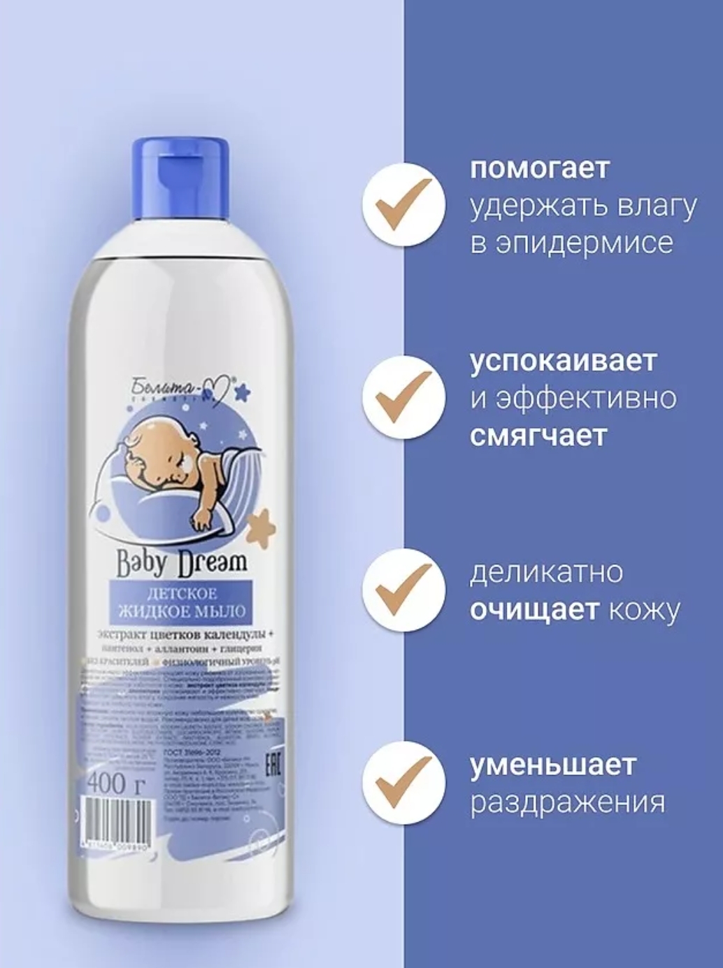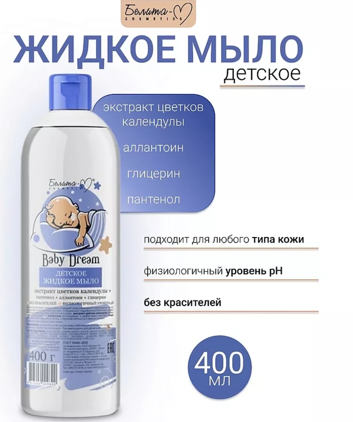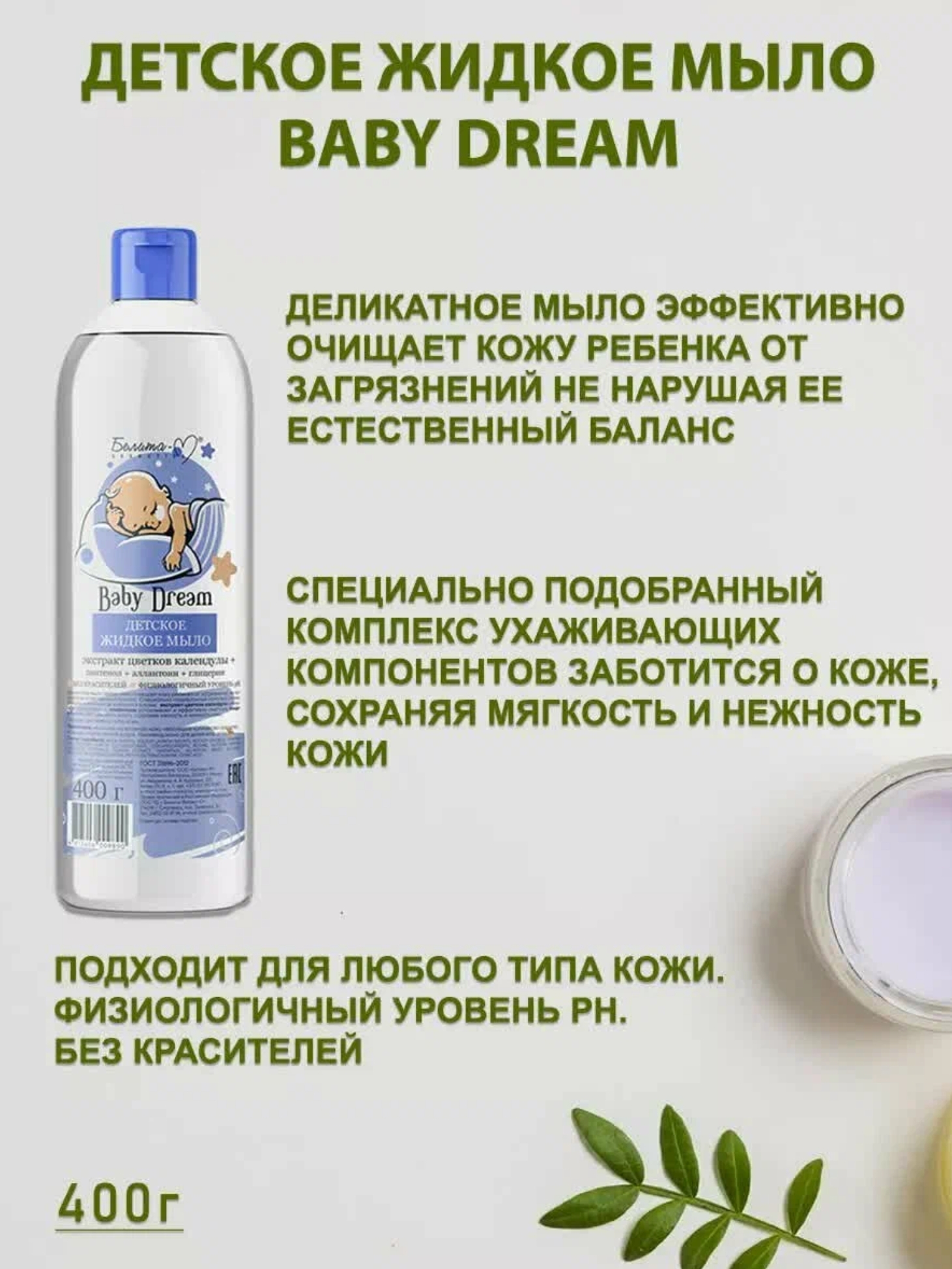Деликатное мыло эффективно очищает кожу ребенка от загрязнений, не нарушая ее естественный баланс. Специально подобранный комплекс ухаживающих компонентов заботится о коже, сохраняя мягкость и нежность кожи. Подходит для любого типа кожи. Физиологичный уровень pH. Без красителей. Активные компоненты: экстракт цветков календулы аллантоин глицерин Действие: деликатно очищает кожу уменьшает раздражения успокаивает и эффективно смягчает помогает удержать влагу в эпидермисе Состав: AQUA (WATER), SODIUM LAURETH SULFATE, SODIUM CHLORIDE, SOYAMIDE DEA, DISODIUM LAURETH SULFOSUCCINATE, COCAMIDOPROPYL BETAINE, GLYCERIN, PARFUM, CALENDULA OFFICINALIS FLOWER EXTRACT, PANTHENOL, ALLANTOIN, BENZYL ALCOHOL, METHYLCHLOROISOTHIAZOLINONE, METHYLISOTHIAZOLINONE, CITRIC ACID.