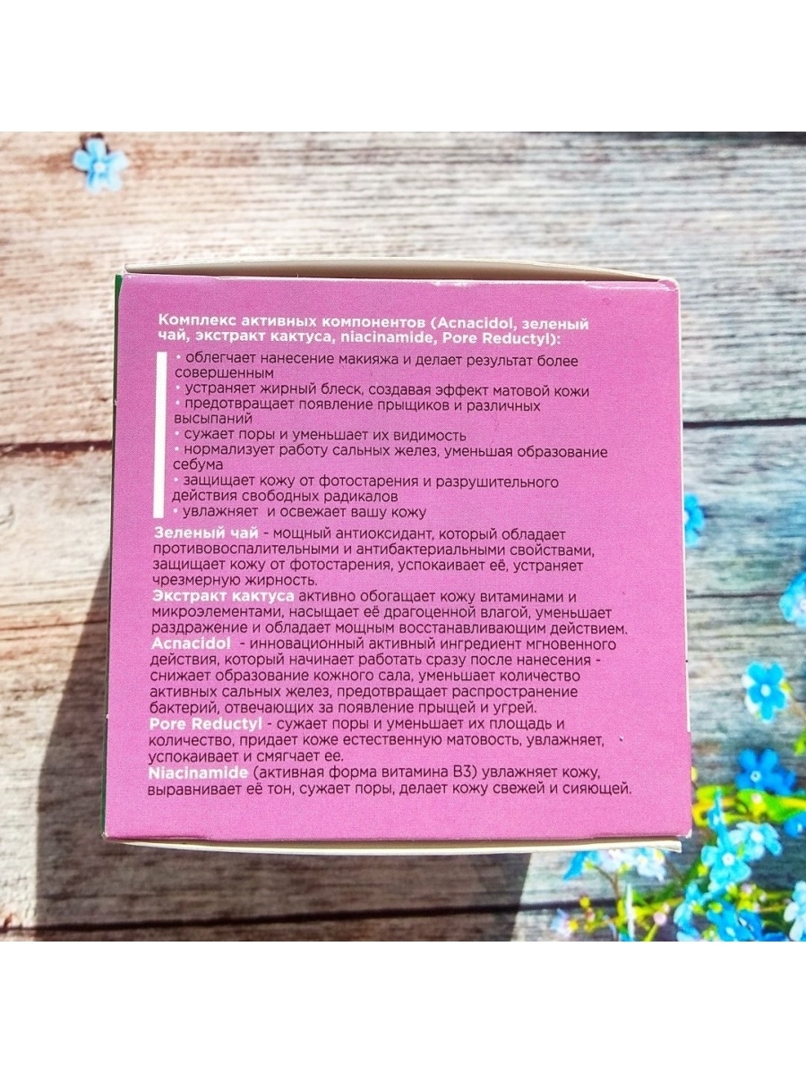 Ухаживает за вашей кожей и преображает её: заполняет неровности кожи, фиксирует макияж, создавая эффект идеальной кожи. Комплекс активных компонентов (Acnacidol, зеленый чай, экстракт кактуса, niacinamide, Pore Reductyl): облегчает нанесение макияжа и делает результат более совершенным устраняет жирный блеск, создавая эффект матовой кожи предотвращает появление прыщиков и различных высыпаний сужает поры уменьшает их видимость нормализует работу сальных желез, уменьшая образование себума защищает кожу от фотостарения и разрушительного действия свободных радикалов увлажняет и освежает вашу кожу.