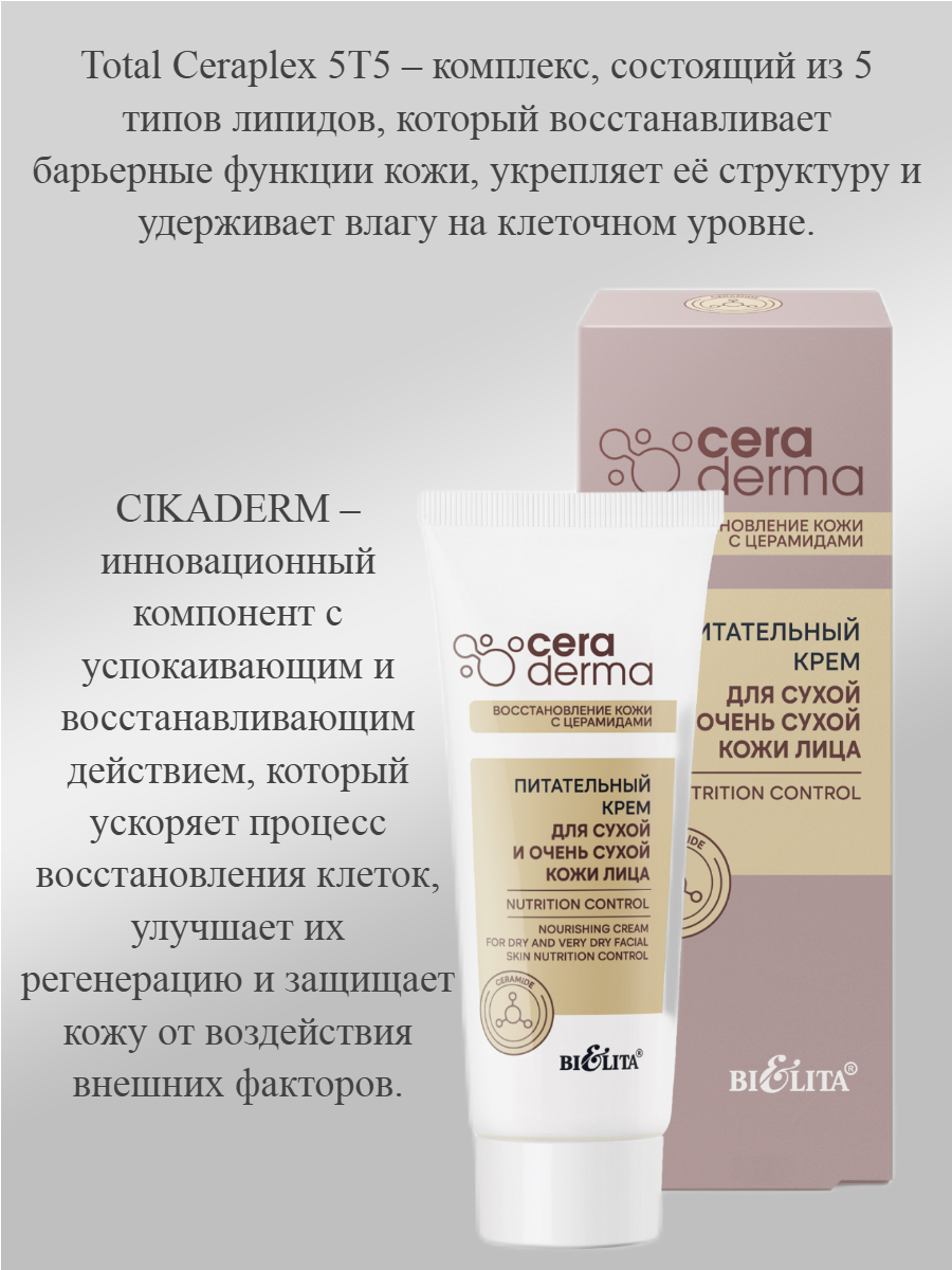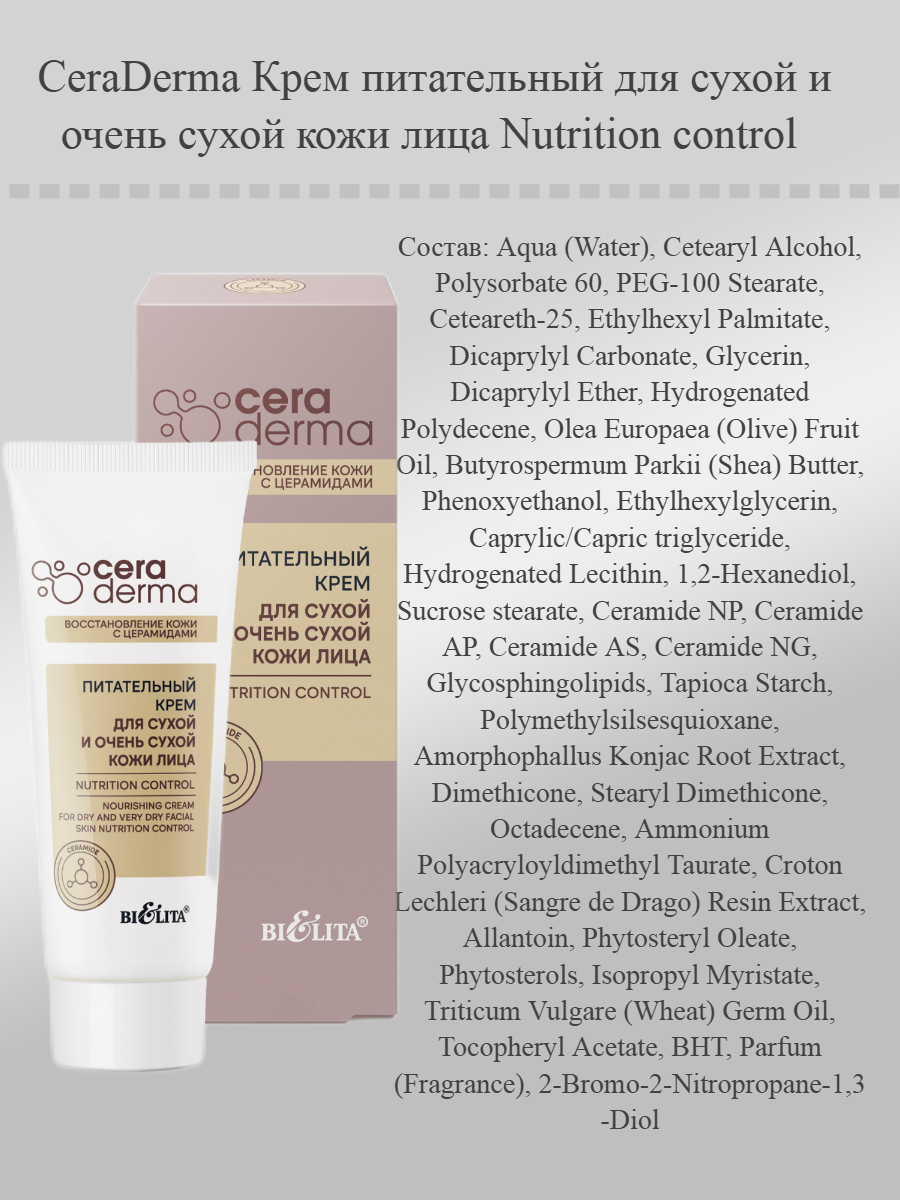 Уникальная формула питательного крема для сухой и очень сухой кожи лица «Nutrition control» интенсивно восстанавливает и увлажняет кожу, обеспечивая ей полноценное питание и защиту. Питательный крем разработан для ухода за особенно требовательной кожей, склонной к сухости и шелушению. Redumatte PSO – помогает нормализовать выработку себума, уменьшая воспаления и покраснения, дарит коже свежесть и матовость. Total Ceraplex 5T5 – комплекс, состоящий из 5 типов липидов, который восстанавливает барьерные функции кожи, укрепляет её структуру и удерживает влагу на клеточном уровне. Konjac Mannan – природный увлажнитель, который создаёт защитную плёнку, удерживающую влагу в коже, оставляя её мягкой и эластичной. Аллантоин – ускоряет процесс заживления микротрещин и раздражений, успокаивает и увлажняет кожу, улучшая её текстуру. Масло Ши – обогащает кожу жирными кислотами, витаминами и антиоксидантами, питает и восстанавливает даже очень сухую кожу. CIKADERM – инновационный компонент с успокаивающим и восстанавливающим действием, который ускоряет процесс восстановления клеток, улучшает их регенерацию Состав: Aqua (Water), Cetearyl Alcohol, Polysorbate 60, PEG-100 Stearate, Ceteareth-25, Ethylhexyl Palmitate, Dicaprylyl Carbonate, Glycerin, Dicaprylyl Ether, Hydrogenated Polydecene, Olea Europaea (Olive) Fruit Oil, Butyrospermum Parkii (Shea) Butter, Phenoxyethanol, Ethylhexylglycerin, Caprylic/Capric triglyceride, Hydrogenated Lecithin, 1,2-Hexanediol, Sucrose stearate, Ceramide NP, Ceramide AP, Ceramide AS, Ceramide NG, Glycosphingolipids, Tapioca Starch, Polymethylsilsesquioxane, Amorphophallus Konjac Root Extract, Dimethicone, Stearyl Dimethicone, Octadecene, Ammonium Polyacryloyldimethyl Taurate, Croton Lechleri (Sangre de Drago) Resin Extract, Allantoin, Phytosteryl Oleate, Phytosterols, Isopropyl Myristate, Triticum Vulgare (Wheat) Germ Oil, Tocopheryl Acetate, BHT, Parfum (Fragrance), 2-Bromo-2-Nitropropane-1,3-Diol