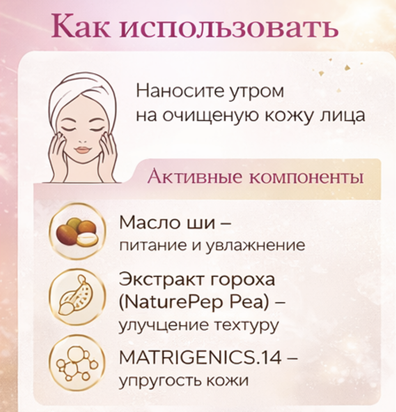 Применение: наносите утром на очищенную кожу лица.