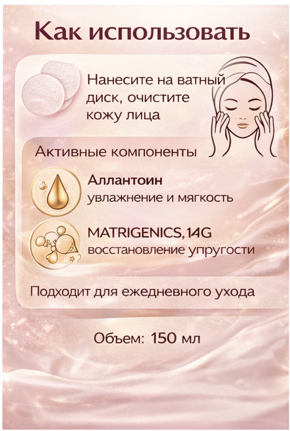 Применение: нанесите средство на ватный диск и очистите кожу лица.