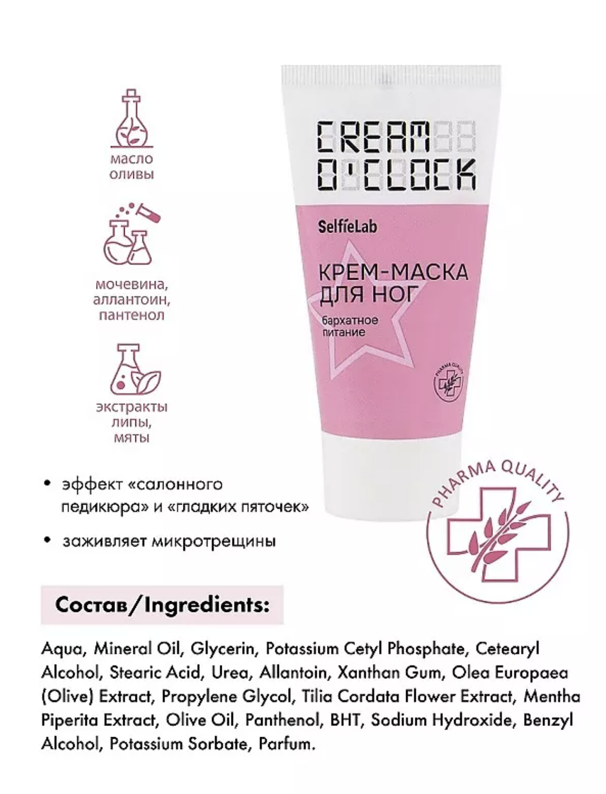 Крем-маска для ног станет великолепным помощником на пути к гладкой и мягкой коже пяток и пальчиков ног. Смягчает, дарит ногам ощущение комфорта, компоненты крема защищают от пересыхания и образования сухих мозолей и трещин. Мочевина – размягчение кожи, антисептический, дезодорирующий и увлажняющий эффект. Аллантоин смягчает роговой слой, способствуя отделению отмерших клеток, стимулирует регенерацию тканей. Вазелиновое масло-смягчение кожи.Масло оливы помогает коже при сухости и обезвоженности; способствует быстрому восстановлению кожи после ультрафиолета; смягчает. Д-пантенол витамин группы В, поддерживает естественный, природный энергетиче-ский баланс кожи и предохраняет ее от высыхания, способствует восстановлению клеток и реабилитации поврежденных тканей. Экстракт мяты цветков освежает кожу; успокаивает и смягчает кожу. Экстракт липы- смягчает, увлажняет и успокаивает кожу. Экстракт оливы–эффективно смягчает и увлажняет сухую кожу ног и кутикулы.