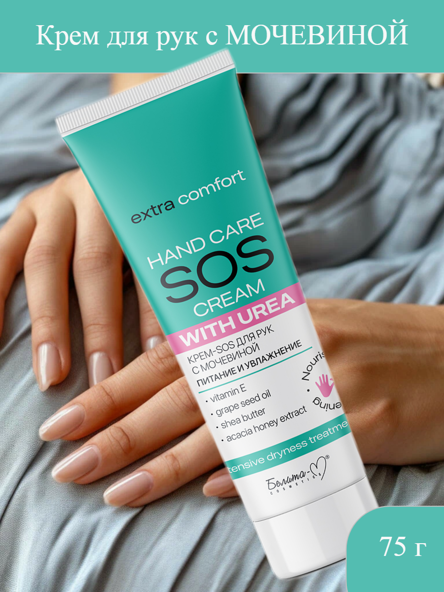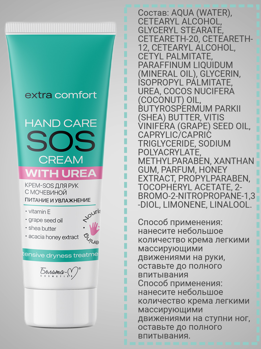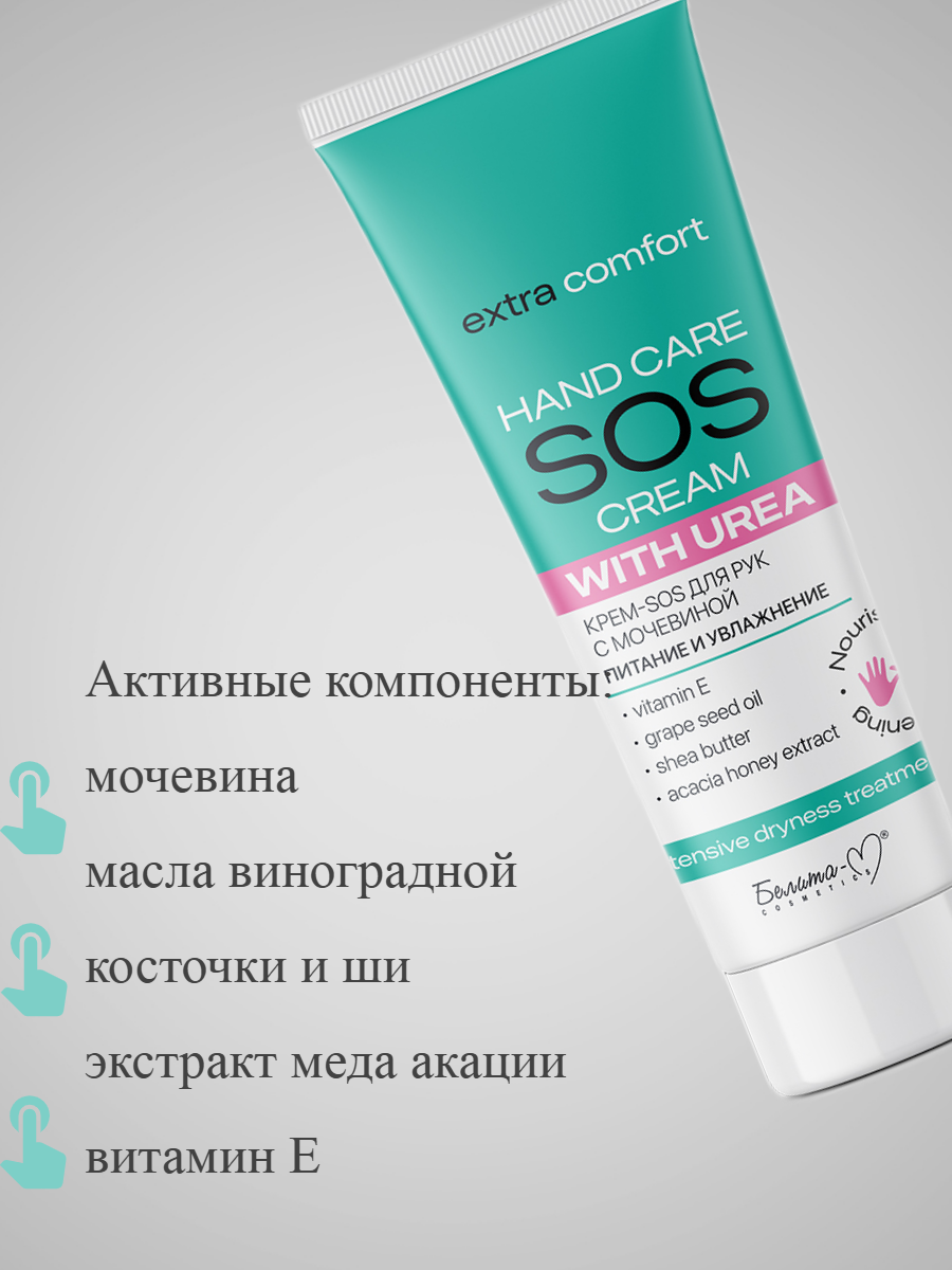 Интенсивный уход от сухости и стянутости. Насыщенная активными компонентами SOS-формула интенсивно питает и увлажняет кожу рук, моментально устраняя ощущения сухости и стянутости, дарит чувство комфорта и ухоженный вид.