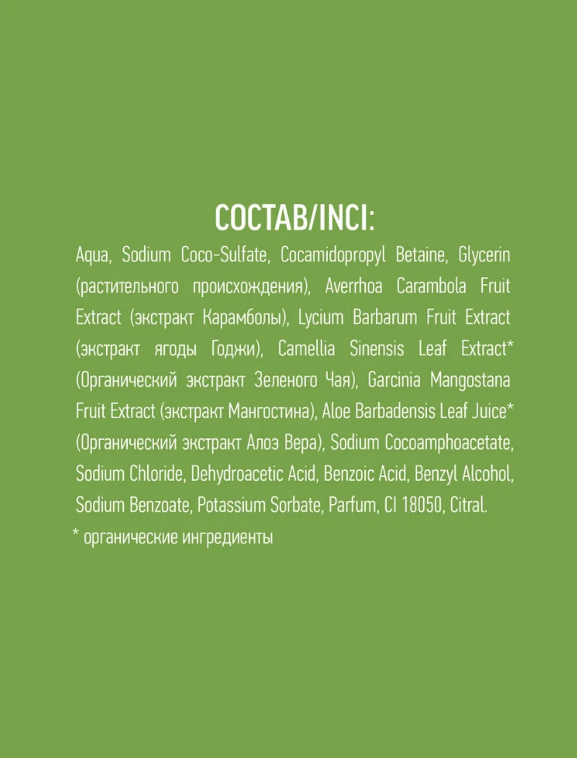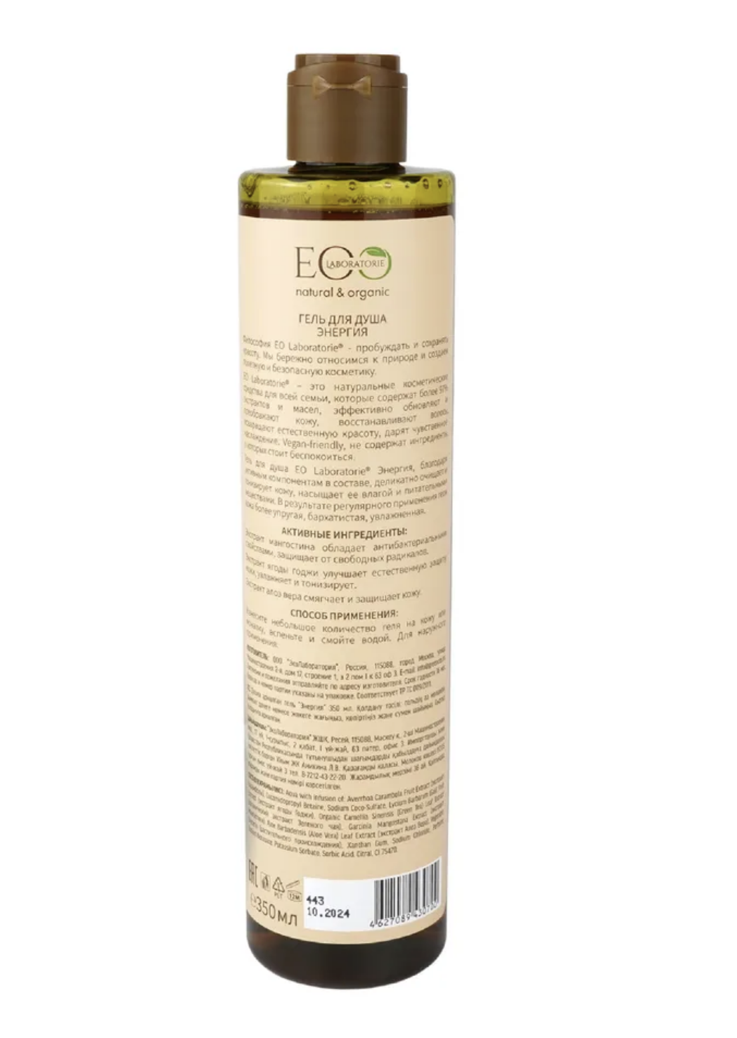 Гель для душа "Энергия" Эколаб содержит 95% ингредиентов растительного происхождения. Входящий в состав органический экстракт зеленого чая придает коже упругость, оказывает на кожу антибактериальное и противовоспалительное воздействие, улучшает насыщение кожи биологически активными и питательными веществами. Экстракт алое вера увеличивает синтез коллагена, стимулирует обменные процессы, тонизирует и увлажняет кожу. Продукт не содержит SLS, парабенов и силиконов. Экстракт мангостина обладает сильными антибактериальными свойствами и отлично справляется со свободными радикалами, приводящими к увяданию и ослаблению местного иммунитета кожи. Экстракт ягоды годжи улучшает естественную защиту кожи, увлажняет, тонизирует и защищает.