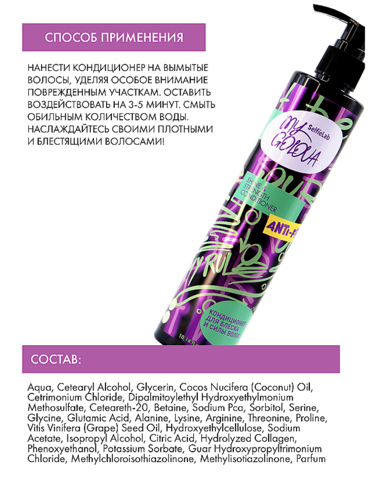 Shine bright like a diamond – это девиз твоих волос. Сила и блеск исходят из самой глубины волоса после использования кондиционера SHINE&STRENGHT. Комплекс аминокислот удерживает влагу, насыщает, питает по всей длине и усиливает образование коллагена. Гидролизат кератина заполняет волос, делает его гладким, блестящим и эластичным. Масла кокоса и виноградной косточки решат проблему сухости и ломкости волос, защитят их от вредного воздействия окружающей среды. Состав: Aqua, Cetearyl Alcohol, Glycerin, Cocos Nucifera (Coconut) Oil, Cetrimonium Chloride, Dipalmitoylethyl Hydroxyethylmonium Methosulfate, Ceteareth-20, Betaine, Sodium Pca, Sorbitol, Serine, Glycine, Glutamic Acid, Alanine, Lysine, Arginine, Threonine, Proline, Vitis Vinifera (Grape) Seed Oil, Hydroxyethylcellulose, Sodium Acetate, Isopropyl Alcohol, Citric Acid, Hydrolyzed Collagen, Phenoxyethanol, Potassium Sorbate, Guar Hydroxypropyltrimonium Chloride, Methylchloroisothiazolinone, Methylisotiazolinone, Parfum
