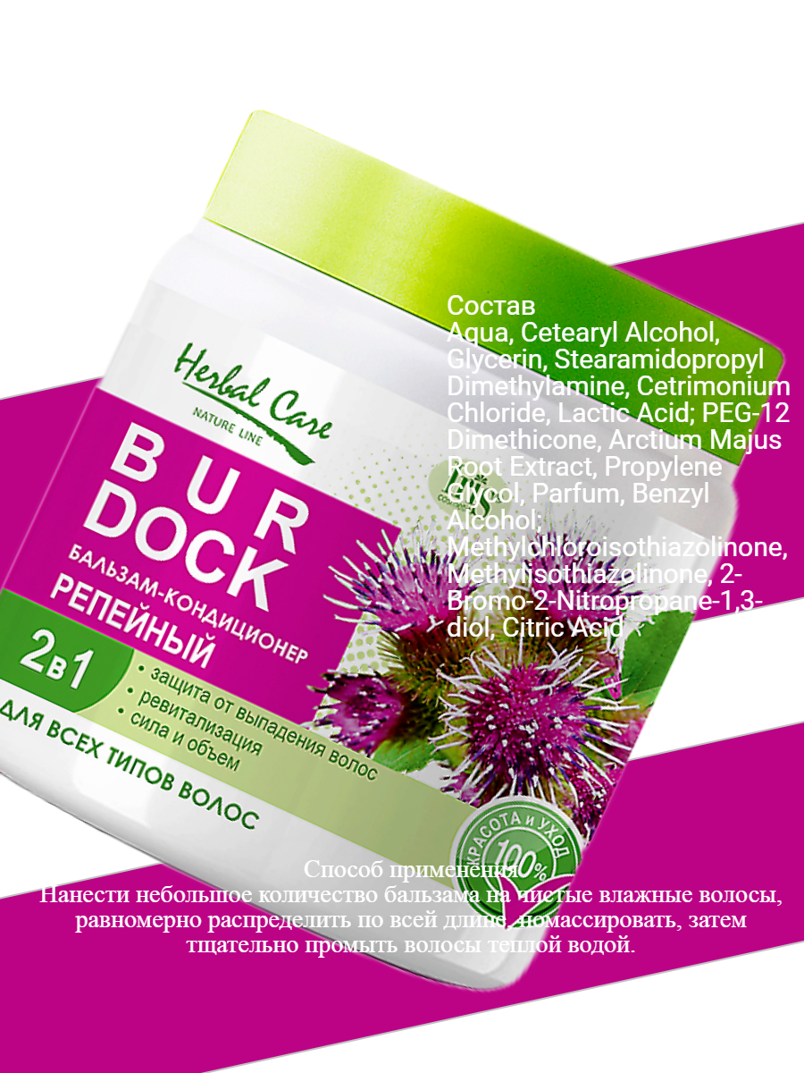 Защита от выпадения волос Ревитализация Сила и объем Бальзам-кондиционер предназначен для комплексного ухода за всеми типами волос. Экстракт РЕПЕЙНИКА содержит витамины А, С, Е и группы В, насыщенные жирные кислоты, протеины, минеральные соли, благодаря которым оказывает укрепляющее действие, активно питает слабые волосы, препятствует их выпадению, восстанавливает структуру истощенных окрашиванием волос. Кондиционер натурального происхождения облегчает расчесывание и укладку волос, защищает, придает им дополнительный объем и легкость. Применение: нанести небольшое количество бальзама на чистые влажные волосы, равномерно распределить по всей длине, помассировать, затем тщательно промыть волосы теплой водой.