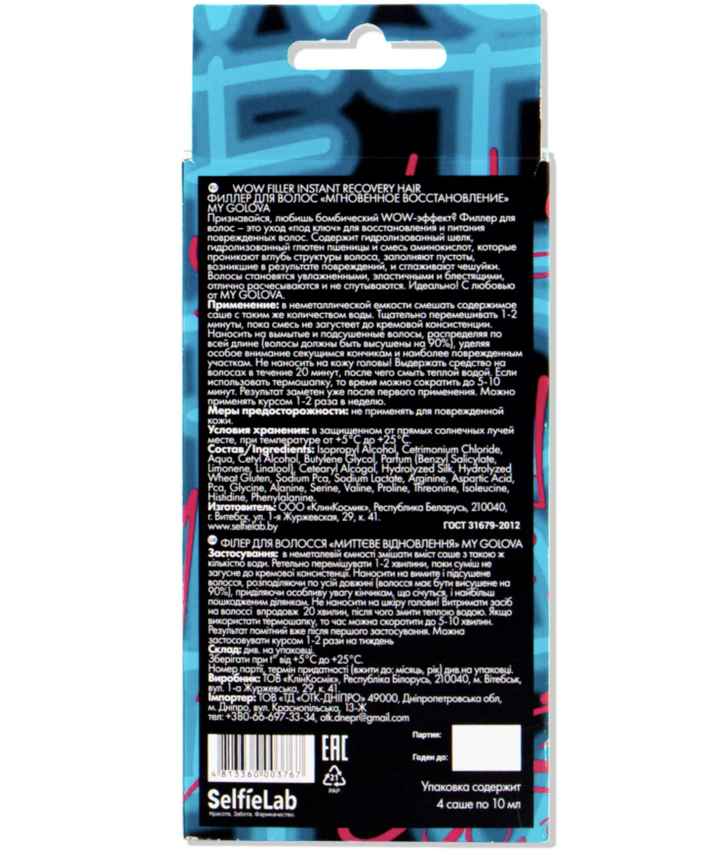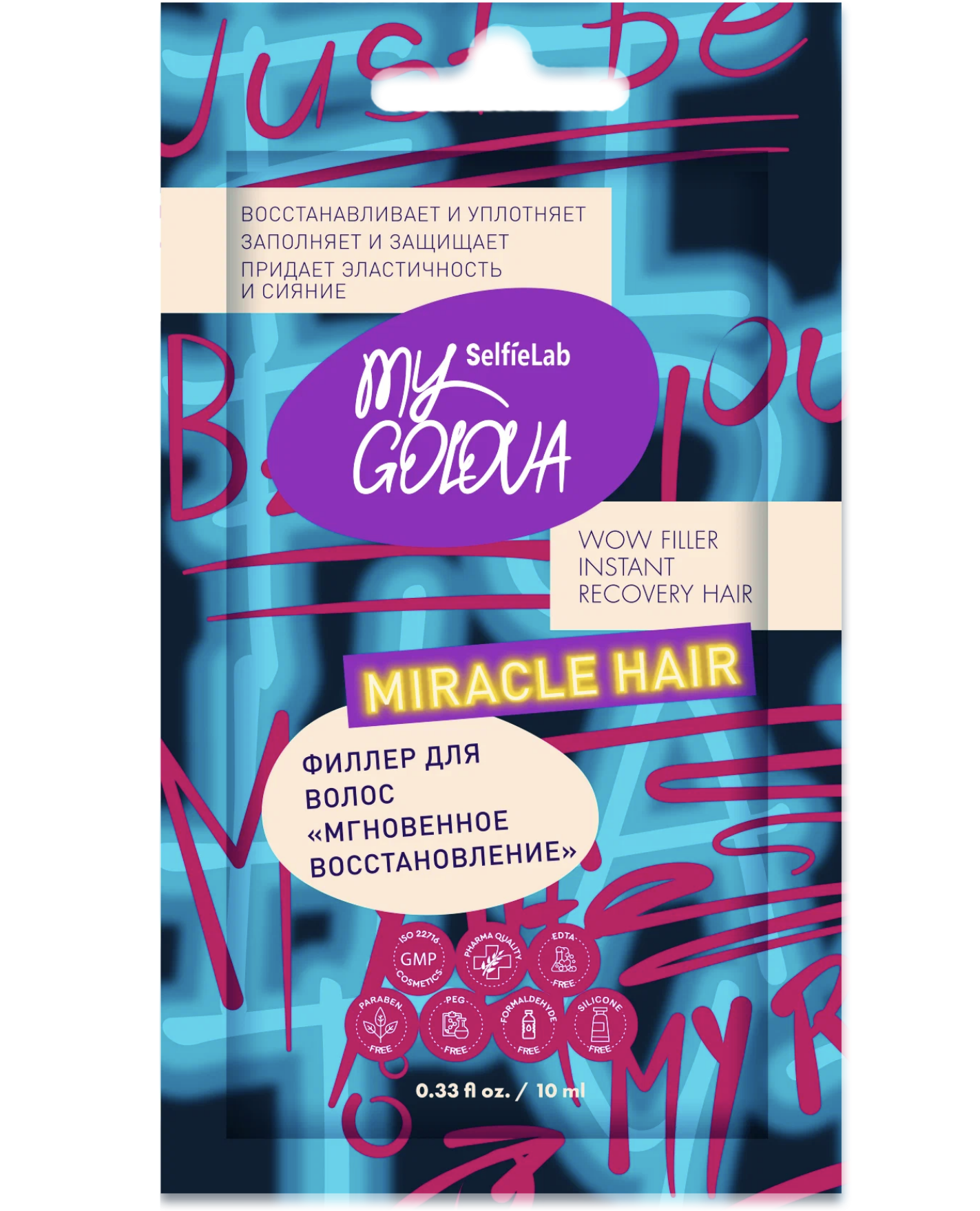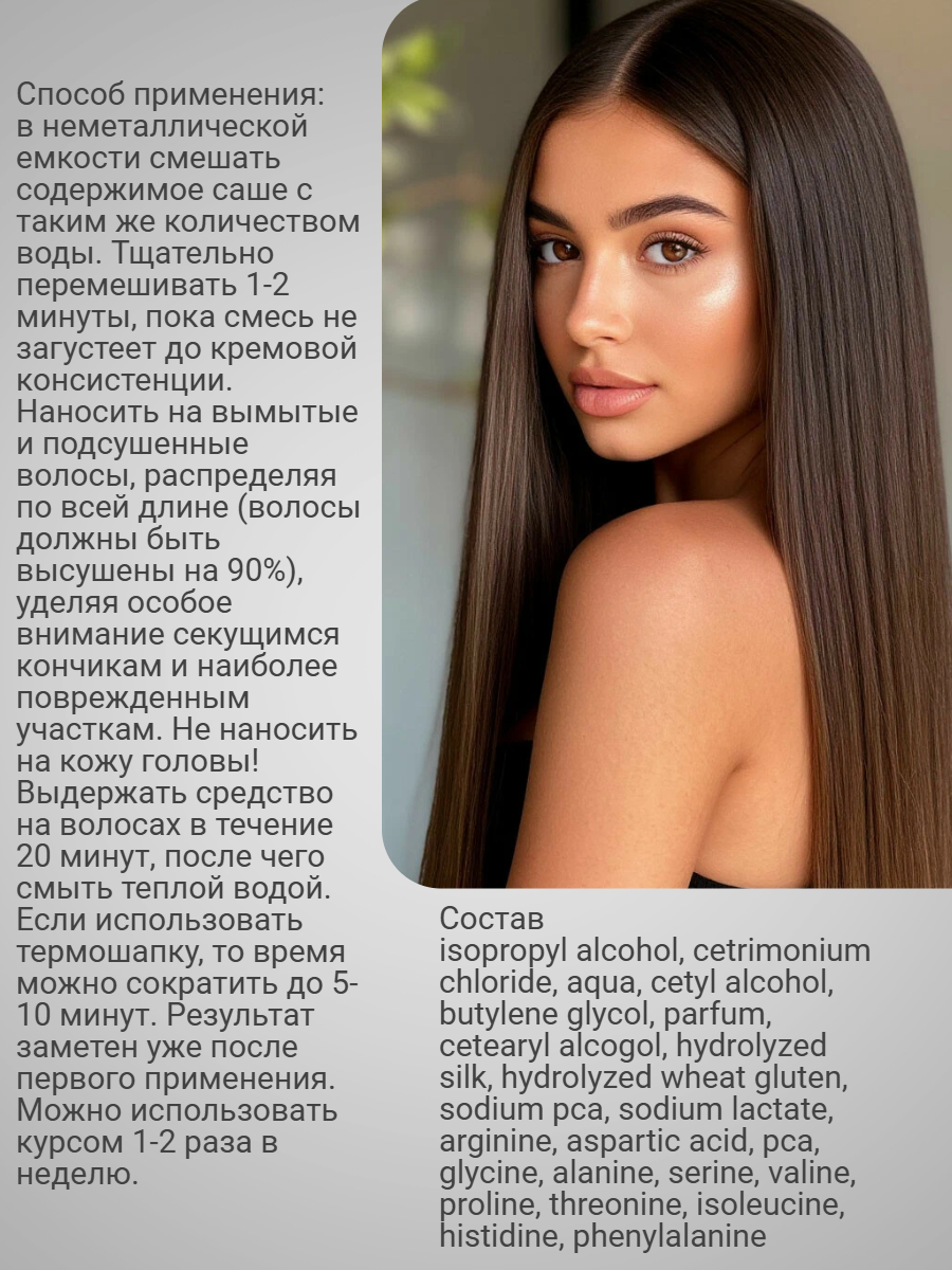 Признавайся, любишь бомбический WOW-эффект? Филлер для волос – это уход «под ключ» для восстановления и питания поврежденных волос. Содержит протеины шелка, пшеницы, аминокислоты, которые проникают вглубь структуры волоса, заполняют пустоты, возникшие в результате повреждений, и сглаживают чешуйки. Волосы становятся увлажненными, эластичными и блестящими, отлично расчесываются и не спутываются. Идеально! С любовью от MY GOLOVA. Способ применения: В неметаллической емкости смешать содержимое саше с таким же количеством воды. Тщательно перемешивать 1-2 минуты, пока смесь не загустеет до кремовой консистенции. Наносить на вымытые и подсушенные волосы, распределяя по всей длине (волосы должны быть высушены на 90%), уделяя особое внимание секущимся кончикам и наиболее поврежденным участкам. Не наносить на кожу головы! Выдержать средство на волосах в течение 20 минут, после чего смыть теплой водой. Если использовать термошапку, то время можно сократить до 5-10 минут. Результат заметен уже после первого применения. Можно использовать курсом 1-2 раза в неделю.