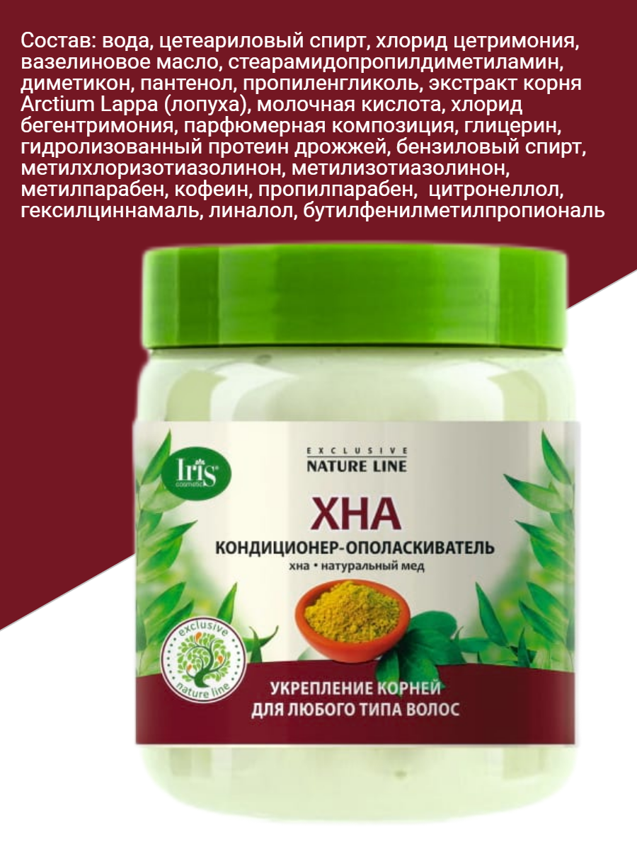 500 мл. 500 мл. Кондиционер-ополаскиватель Iris cosmetic Exclusive nature line Хна предназначен для укрепления волос и стимулирования их роста. Он подходит для любого типа волос и обеспечивает комплексный уход, благодаря натуральным составляющим. Одним из активных ингредиентов является хна, которая обеспечивает рост здоровых, сильных и блестящих волос. Натуральный мед, богатый ценными биоактивными веществами, такими как сахара, аминокислоты, витамины, ферменты и микроэлементы, активно восстанавливает волосы по всей длине, делая их более густыми и объемными. Кондиционер-ополаскиватель Iris cosmetic Exclusive nature line Хна выпускается в удобной банке объемом 500 мл. Способ применения прост: нанесите небольшое количество средства на влажные волосы, распределите по всей длине, помассируйте и тщательно промойте волосы теплой водой. Состав кондиционера-ополаскивателя включает Aqua, Cetearyl Alcogol, Cetrimonium Chloride, Behantrimonium Chloride, Parfume, Goat Milk Extract, Hordeum Vulgare (Barley)Seed Extract, Avena Sativa (Oat) Meal Extract, Triticum Vulgare (Wheat) Seed Extract, Benzyl Alcohol, Mhetylchloroizothiazolinone, Methylisothiazolinone, Citric Acid. Упаковка кондиционера-ополаскивателя выполнена в виде удобной банки, что обеспечивает сохранность продукта и удобство использования. Выбирая кондиционер-ополаскиватель Iris cosmetic Exclusive nature line Хна, вы получаете эффективное средство для укрепления волос и стимуляции их роста, а также натуральный уход за волосами, который подарит вашим волосам здоровье и силу.