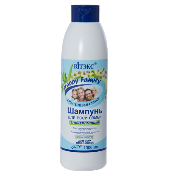 Шампунь для всей семьи Happy Family с алоэ и ромашкой бережно очищает волосы и кожу головы, не пересушивая их. Кондиционирующие компоненты шампуня придают волосам силу, блеск и эластичность. Специальная мягкая формула помогает обеспечить полноценный уход волосам любого типа. Алоэ вера насыщает волосы протеинами, микроэлементами, минеральными солями. Волосы укрепляются по всей длине, становятся более сильными, ускоряется их рост. Ромашка оказывает на кожу головы смягчающее и успокаивающее действие, возвращает волосам естественный блеск и природную силу. Результат после применения: красивые, здоровые, сильные волосы Рекомендуется использовать в сочетании с бальзамом-кондиционером для волос «Happy Family» Экономичный объем 1 л