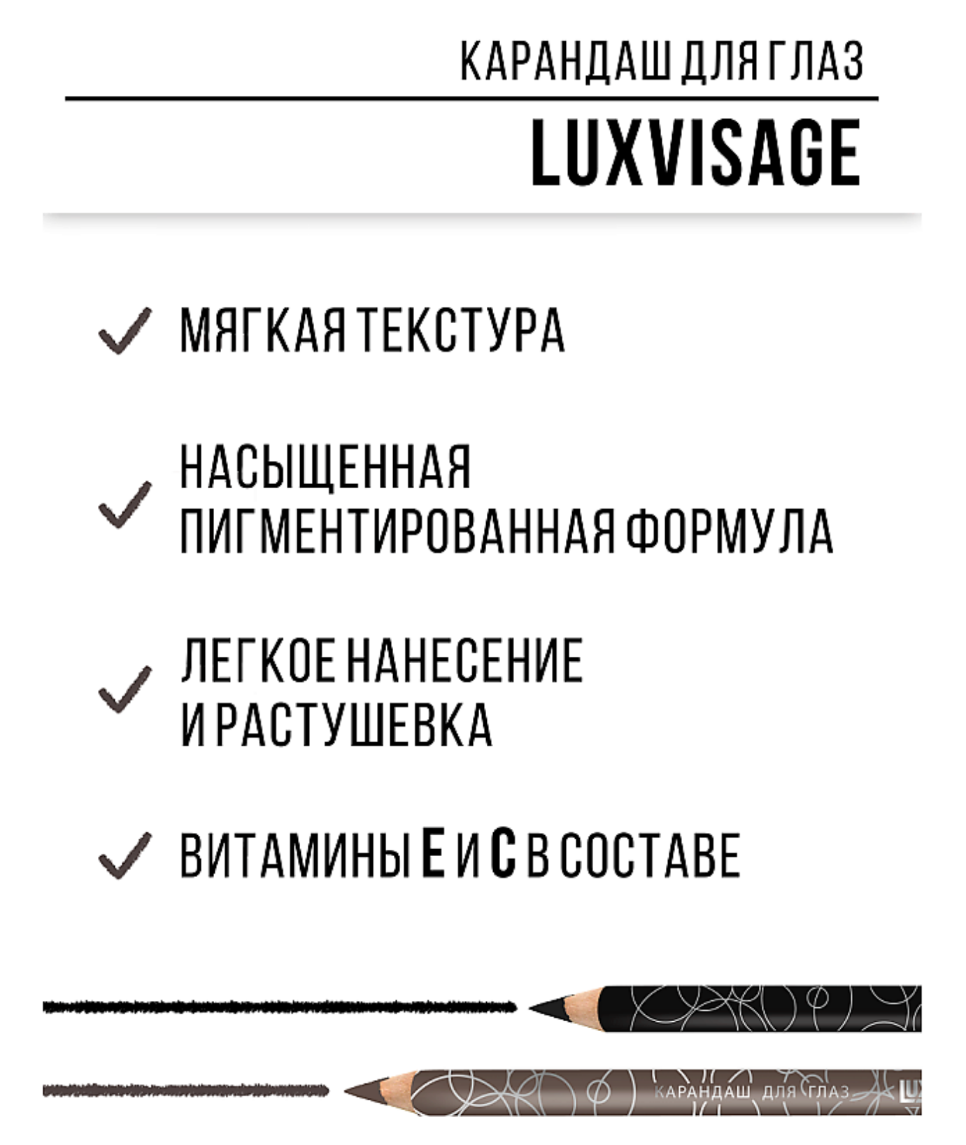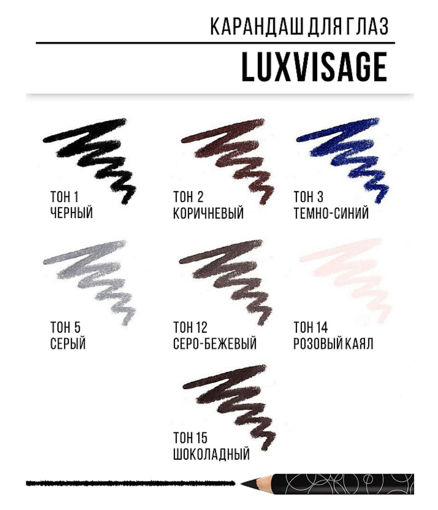 Коллекция карандашей для глаз от LUXVISAGE — ваше секретное оружие для создания стойкого, выразительного макияжа. Он подчеркнет разрез глаз и добавит к вашему макияжу цветовой акцент. Мягкая и насыщенная текстура карандаша отлично наносится и растушевывается.