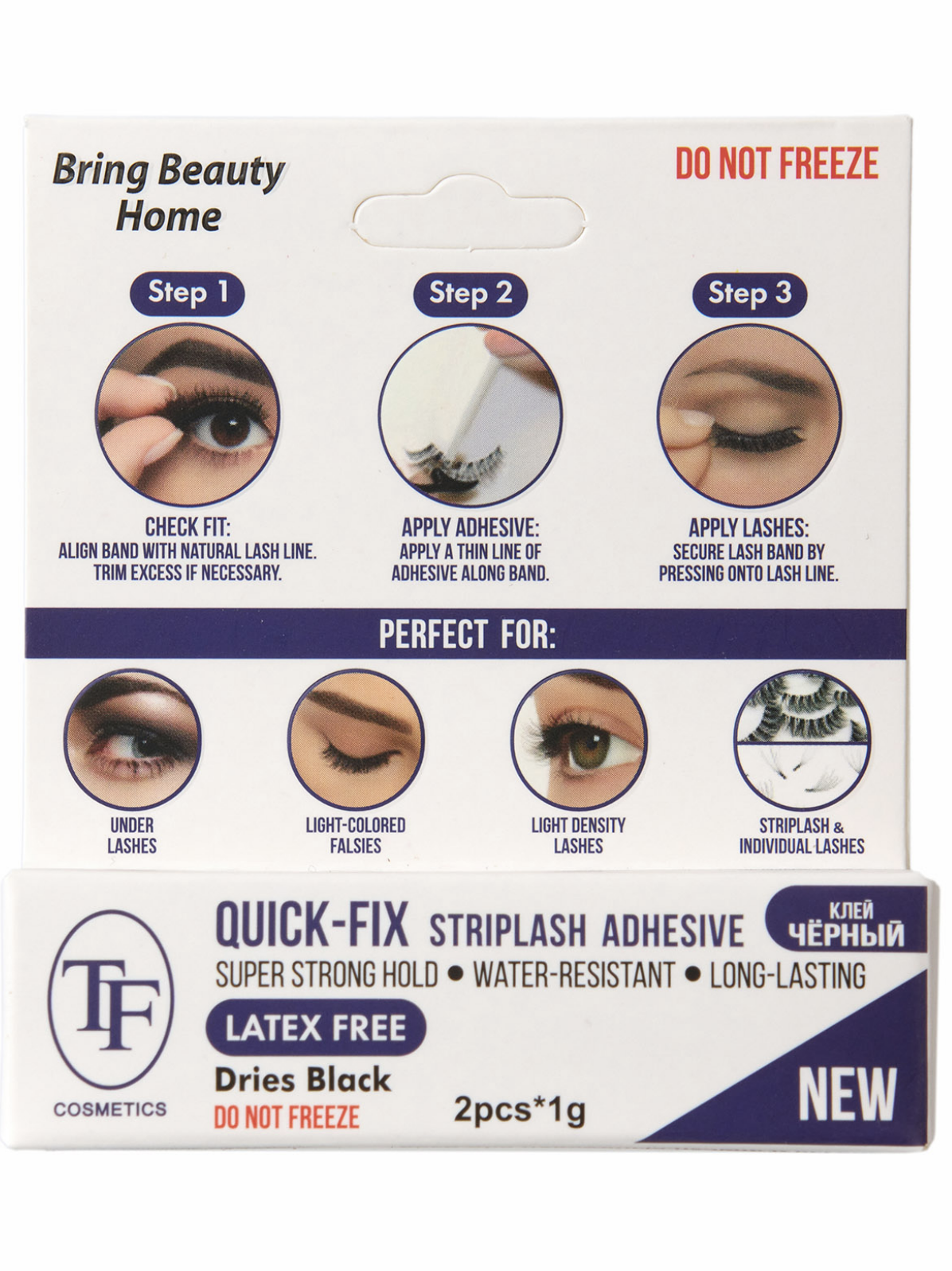 Обеспечивает надежную, сверхсильную и быструю фиксацию накладных ресниц и пучков на 24 часа.Деликатный состав клея не приносит дискомфорта и раздражения. Белый цвет клея при высыхании становится полностью прозрачным и невидимым на веках и ресницах. Высыхает за несколько секунд. Водостойкий. НЕсодержит латекса, формальдегида, без запаха. Способ применения: нанести тонкую линию клея на кромку основания накладных ресниц или пучков. Подождите несколько секунд. Аккуратно приложите основание по линии роста ресниц, немного нажмите, чтобы зафиксировать.