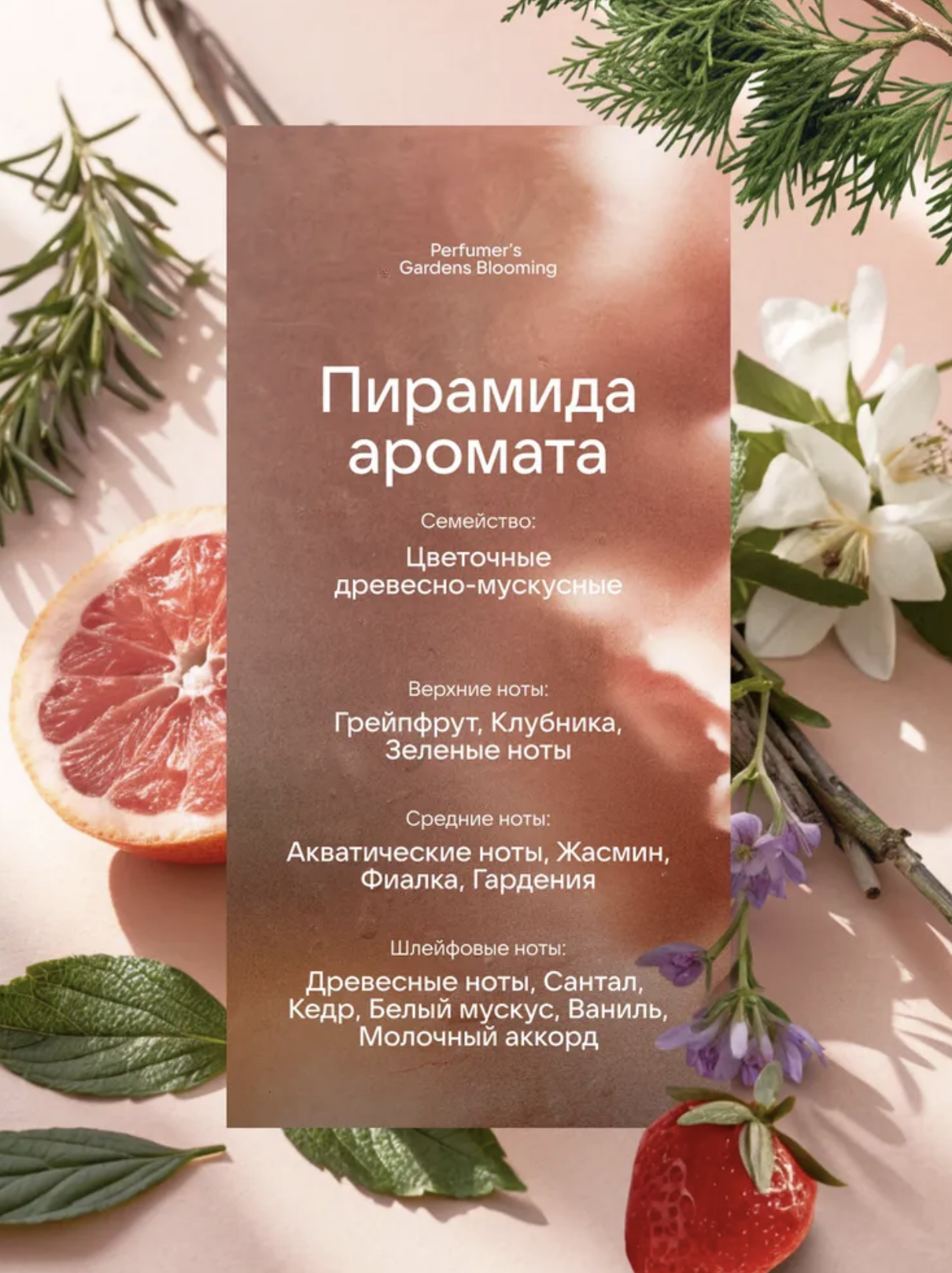 Perfumer’s Gardens Blooming — это история про тихое утро, когда первые лучи солнца проникают сквозь распустившиеся цветы гардении, ее великолепные белоснежные лепестки искрятся в свете. Начальные ноты грейпфрута и клубники создают чувство свежести, как лёгкий ветерок, приносящий с собой радость и надежду.