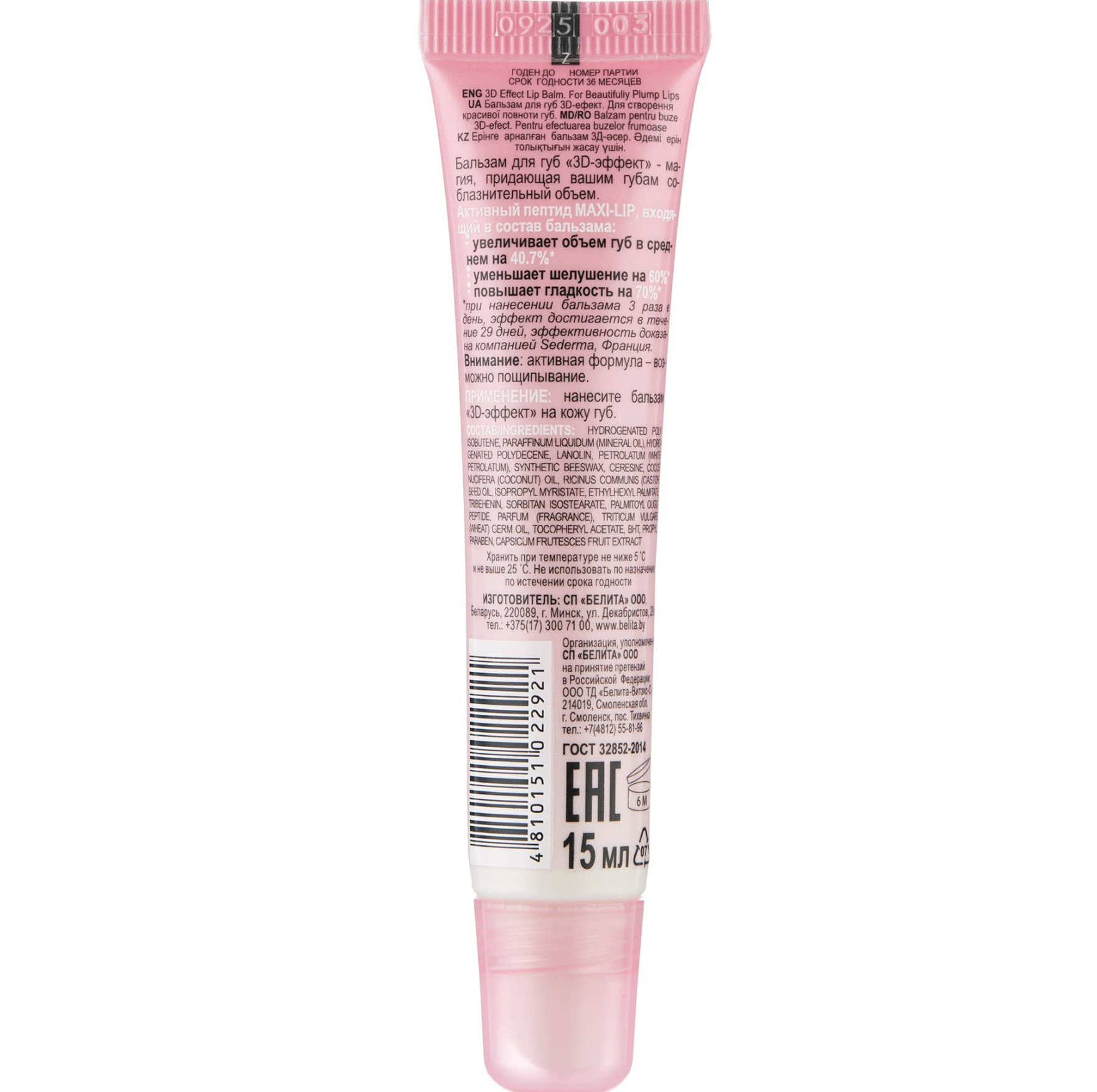 Для создания красивой полноты губ пленительный объем привлекательный блеск бережная забота и увлажнение Нежная текстура бальзама равномерно ложится на губы и дарит приятный блеск. Входящий в состав бальзама комплекс активных компонентов при регулярном использовании заметно увеличивает губы в объеме. Внимание: активная формула — возможно пощипывание.