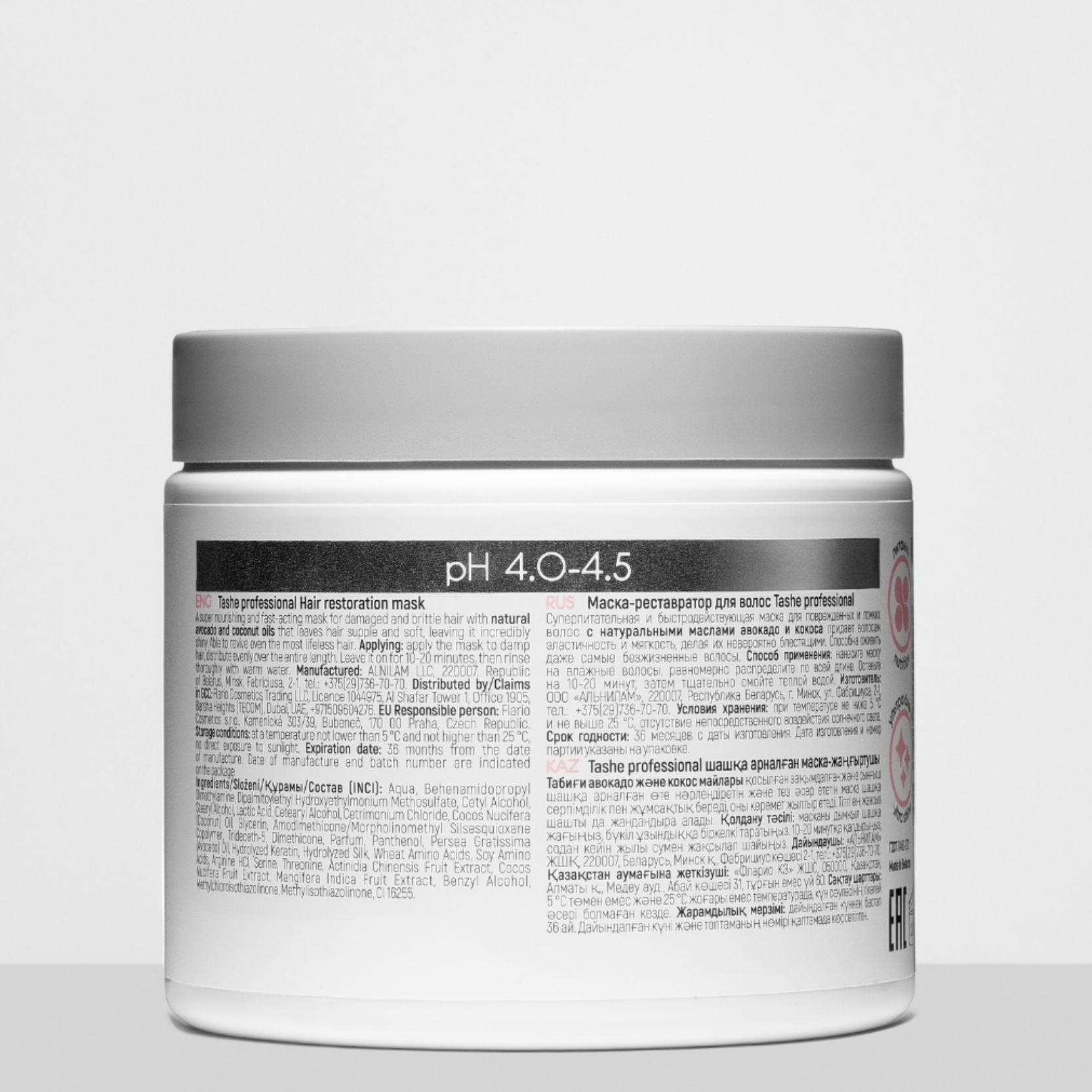 Волосы выглядят шелковистыми и напитанными на 47%, при регулярном использовании процент возрастает Маска для глубокого питания и восстановления волос. Поможет привести волосы в идеальный вид в кратчайшие сроки, даже для самые сухие, поврежденные, пористые и окрашенные волосы. Натуральные масла авокадо и кокоса проникают в стержень волоса, питая его по всей длине. Активные компоненты укрепляют полотно волос, предотвращают ломкость без утяжеления. Смесь экстрактов кокоса, манго и киви реконструируют поврежденные волосы, оказывает ухаживающее действие и защищает от негативных внешних воздействий. Натуральный аминокомплекс, гидролизованный кератин и экстракт протеинов шелка в составе маски избавляют ослабленные волосы от ломкости, питают, возвращая их к жизни. Благодаря серину и треонину в составе, маска отлично подойдет для увлажнения и питания наращенных волос, избавляя их от ломкости и сухости. При использовании маски на наращенных волосах избегайте попадания на капсулы. Преимущества: защита от ломкости, интенсивное питание, восстановление Для каких волос: для всех типов волос Ph: 4,0 - 4,5 Срок годности: 36 месяцев со дня изготовления, 12 месяцев после вскрытия