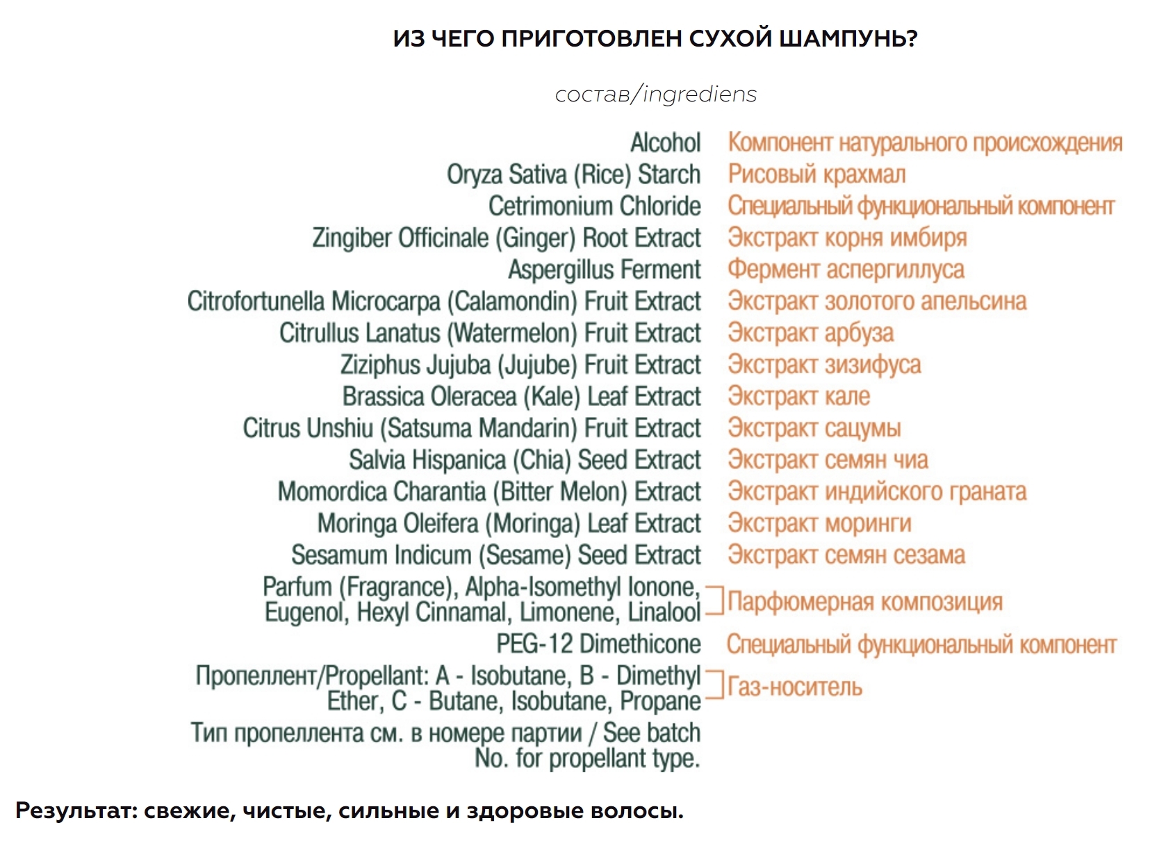 200 мл Сухой шампунь, разработанный по уникальной рецептуре экспертами ВИТЭКС, наполнен экстрактами 100% натурального происхождения. Это не только моментальное очищение волос без воды, но и очень вкусный и полезный смузи-рацион. ИМБИРЬ и ФРУКТОВЫЙ МИКС из чиа, золотого апельсина, арбуза, зизифуса, кале, моринги, сезама, индийского граната и цитруса сацума питают, оздоравливают и укрепляют волосы, придают естественный блеск. Применение: интенсивно встряхивайте баллон в течение 20 секунд. Распылите равномерно с расстояния 10-15 см, помассируйте, тщательно расчешите волосы. В случае засорения – снимите распылитель и промойте водой. Состав: этанол, рисовый крахмал, хлорид цетримония, парфюмерная композиция, ПЭГ-12 диметикон, экстракт корня Zingiber Officinale (имбиря), фермент аспергиллуса, экстракт плодов Citrofortunella Microcarpa (каламондина), экстракт плодов Citrullus Lanatus (арбуза), экстракт плодов Ziziphus Jujuba (зизифуса), экстракт корня Zingiber Officinale (имбиря), экстракт листьев Brassica Oleracea (кале), экстракт плодов Citrus Unshiu (сацумы), экстракт семян Salvia Hispanica (чиа), экстракт Momordica Charantia (индийского граната), экстракт листьев Moringa Oleifera (моринги), экстракт семян Sesamum Indicum (сезама), альфа-изометилионон, эвгенол, гексилциннамаль, лимонен, линалол Пропеллент/Propellant: A - Isobutane, B - Dimethyl Ether, C - Butane, Isobutane, Propane. Тип пропеллента см. в номере партии / See batch No. for propellant type.