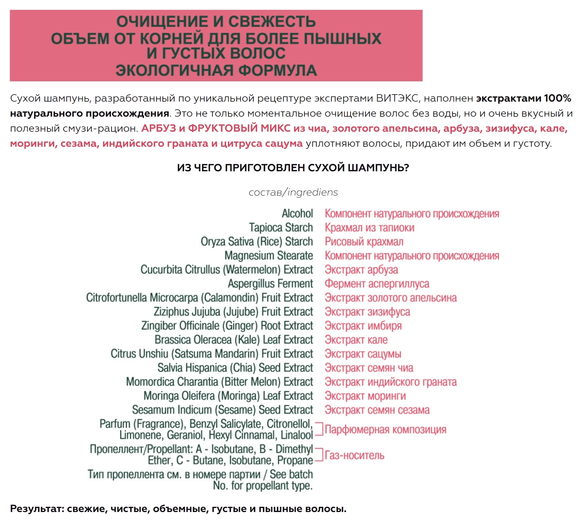 200 мл Сухой шампунь, разработанный по уникальной рецептуре экспертами ВИТЭКС, наполнен экстрактами 100% натурального происхождения. Это не только моментальное очищение волос без воды, но и очень вкусный и полезный смузи-рацион. АРБУЗ и ФРУКТОВЫЙ МИКС из чиа, золотого апельсина, арбуза, зизифуса, кале, моринги, сезама, индийского граната и цитруса сацума уплотняют волосы, придают им объем и густоту. Применение: интенсивно встряхивайте баллон в течение 20 секунд. Распылите равномерно с расстояния 10-15 см, помассируйте, тщательно расчешите волосы. В случае засорения – снимите распылитель и промойте водой. Состав: этанол, крахмал из тапиоки, полиметилсилсесквиоксан, стеарат магния, парфюмерная композиция, фермент аспергиллуса, экстракт плодов Citrofortunella Microcarpa (каламондина), экстракт плодов Citrullus Lanatus (арбуза), экстракт плодов Ziziphus Jujuba (зизифуса), экстракт корня Zingiber Officinale (имбиря), экстракт листьев Brassica Oleracea (кале), экстракт плодов Citrus Unshiu (сацумы), экстракт семян Salvia Hispanica (чиа), экстракт Momordica Charantia (индийского граната), экстракт листьев Moringa Oleifera (моринги), экстракт семян Sesamum Indicum (сезама), экстракт Cucurbita Citrullus (арбуза) Пропеллент/Propellant: A - Isobutane, B - Dimethyl Ether, C - Butane, Isobutane, Propane. Тип пропеллента см. в номере партии / See batch No. for propellant type.