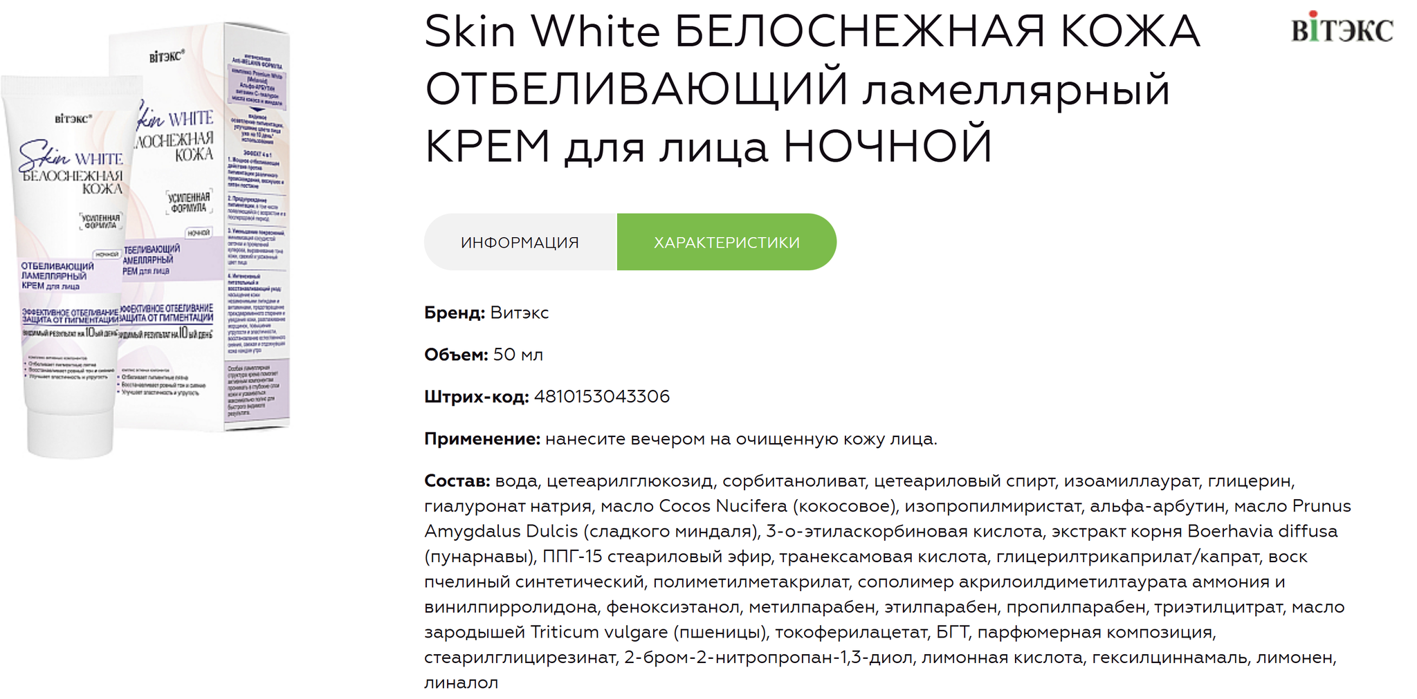 50мл. Мощное отбеливающее действие против пигментации различного происхождения, веснушек и пятен постакне Предупреждение пигментации, в том числе появляющейся с возрастом и в послеродовой период Уменьшение покраснений, минимизация сосудистой сеточки и проявлений купероза, выравнивание тона кожи, свежий и ухоженный цвет лица Интенсивный питательный и восстанавливающий уход: насыщение кожи незаменимыми липидами и витаминами, предотвращение преждевременного старения и увядания кожи, разглаживание морщинок, повышение упругости и эластичности, восстановление естественного сияния, свежая и отдохнувшая кожа каждое утро Высокоактивный комплекс Premium White (Melаvoid) оказывает мощное отбеливающее действие против пигментации всех видов, в том числе возрастной, а также веснушек и пятен постакне, обеспечивая видимый эффект уже на 10 день* применения. Альфа-АРБУТИН и ТРАНЕКСАМОВАЯ КИСЛОТА – одни из наиболее эффективных и безопасных ингредиентов для борьбы с пигментацией и неровным тоном кожи. Ингибируют выработку меланина, осветляют кожу и препятствуют появлению темных пятен, укрепляют стенки сосудов, уменьшают покраснения при куперозе и розацеа, выравнивают цвет лица. Гиалуроновая кислота глубоко и интенсивно увлажняет кожу, повышает ее упругость и тонус, разглаживает морщинки, вызванные обезвоживанием. Витамин С оказывает выраженное антиоксидантное действие, стимулирует синтез коллагена, сужает поры, пробуждает сияние кожи и дарит красивый цвет лица. Ценнейшие масла кокоса и сладкого миндаля активно питают кожу, восстанавливают ее защитную мантию, придают упругость, эластичность и гладкость. Результат: видимое осветление пигментации, улучшение цвета лица уже на 10 день использования. Максимальный результат достигается при комплексном использовании средств линии. Эффект накапливается и усиливается при регулярном применении.